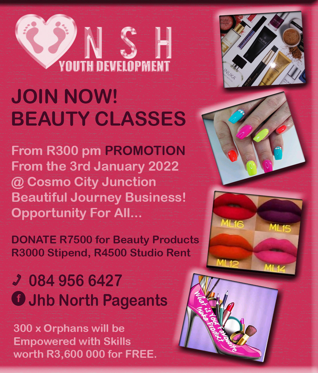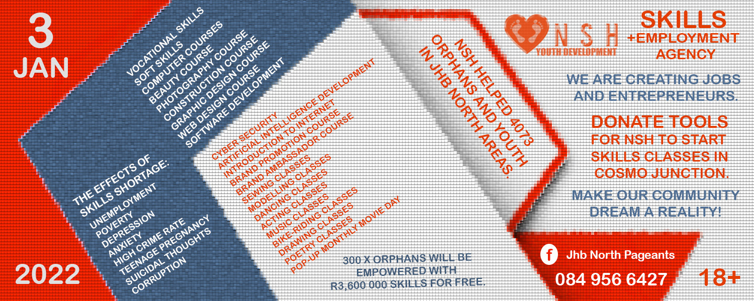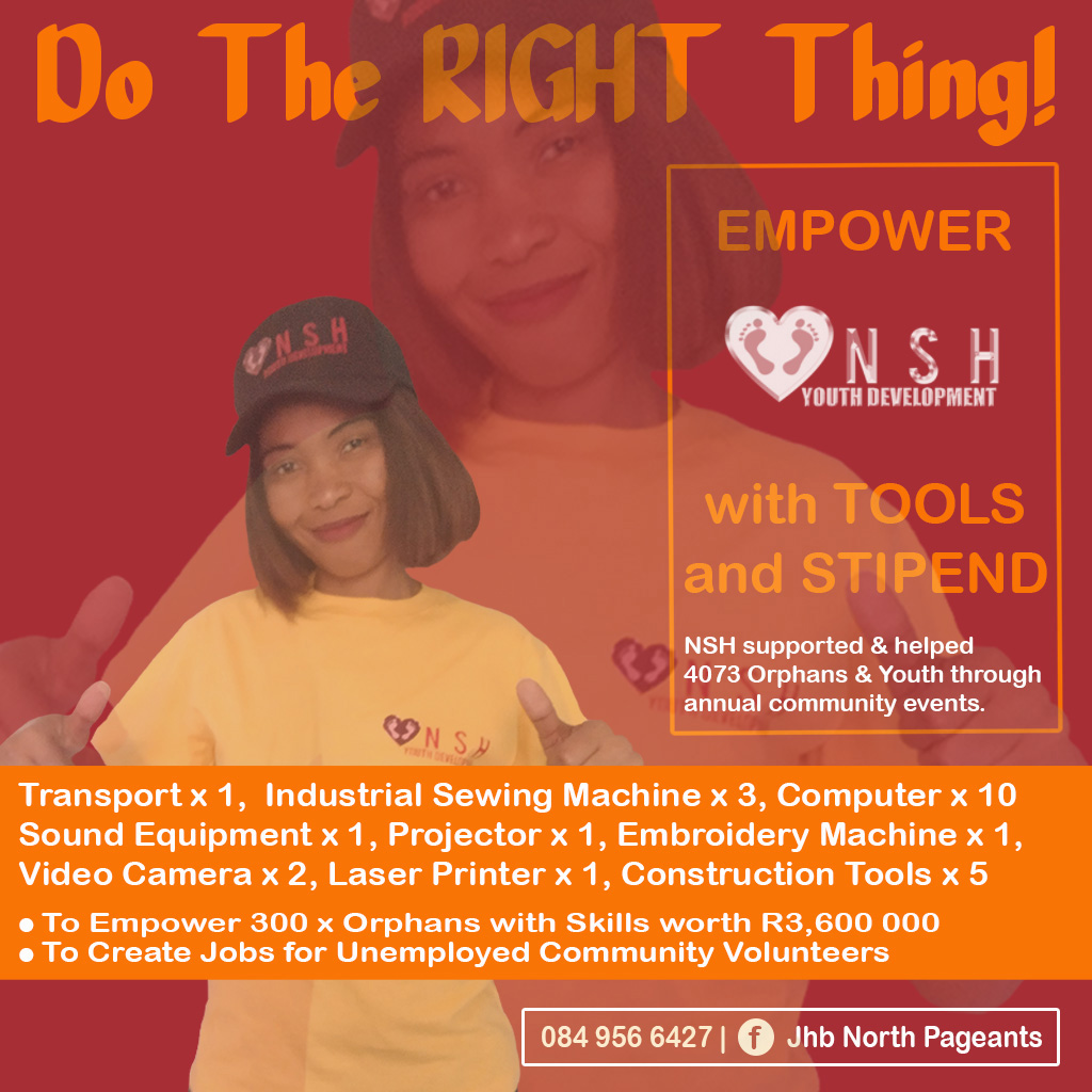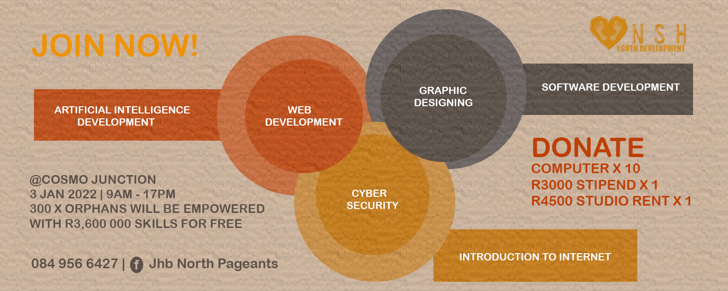 SPONSOR 10 X OLD OR NEW COMPUTERS TO EMPOWER 300 X ORPHANS WITH COMPUTER & VOCATIONAL SKILLS WORTH R3,600 000 FOR FREE. HELP NSH TO START SKILLS CLASSES IN JAN 2022 IN COSMO CITY. WE NEED: Transport x 1, Industrial Sewing Machine x 3, Laser Printer x 1, Website Design, Computers x 5, Stipend x 5, Video Camera x 2, Stage & Lighting x 1, Sound Equipment x 1, Embroidery Machine x 1, Pop Corn Machine x 1, Projector x 1, Ice Cream Machine x 1, Juice Machine x 1, Building Construction Tools, Beauty Products to empower 300 x Orphans with R3,600 000 worth Skills for FREE through Game Twisters Arts Studio. FIGHT HIGH RATE OF UNEMPLOYMENT, POVERTY, TEENAGE PREGNANCY, HUNGER, CORRUPTION, HIGH CRIME RATE, DEPRESSION, ANXIETY, SUICIDAL THOUGHTS, HARDSHIP CAUSED BY SHORTAGE OF SKILLS. NSH OFFERS PROFESSIONAL COUNSELLING SESSIONS FOR FREE! FIGHTING DEPRESSION. Join our Cause at 084 956 6427view more | jhbnorthpageants@gmail.comview email.... Donate Now to NSH Youth Development NPO 221-764, FNB Gold Business Account Number: 62862522466, Diepsloot Branch Code: 260510, Reference: Sponsor Name, PBO SARS Tax Number: 9903521178.