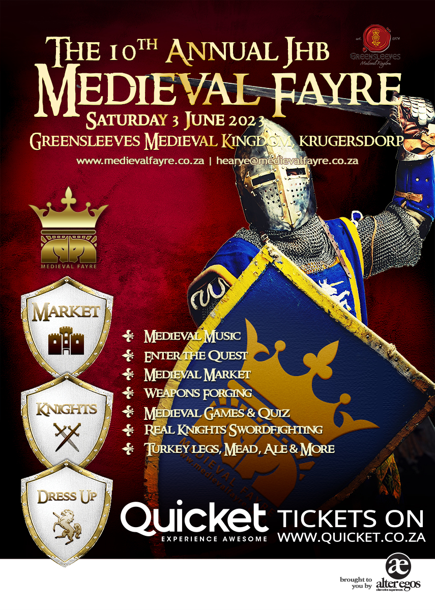 Minstrels, buskers, barons, knights, damsels, dragons, steeds, fairies and nobles alike will be in attendance - as thy wander the Magical Market Place and banter with ye olde merchants, enjoy all manner of medieval culinary delights. Whet thy whistle with authentic mead and quaff ale, all the while experiencing the bustle and brilliance of Ye 10th annual Jhb Magical Medieval Fayre.