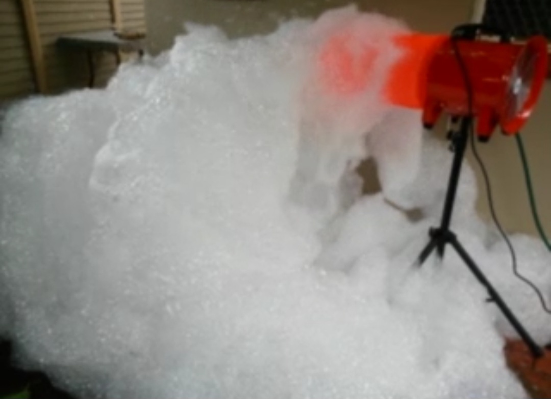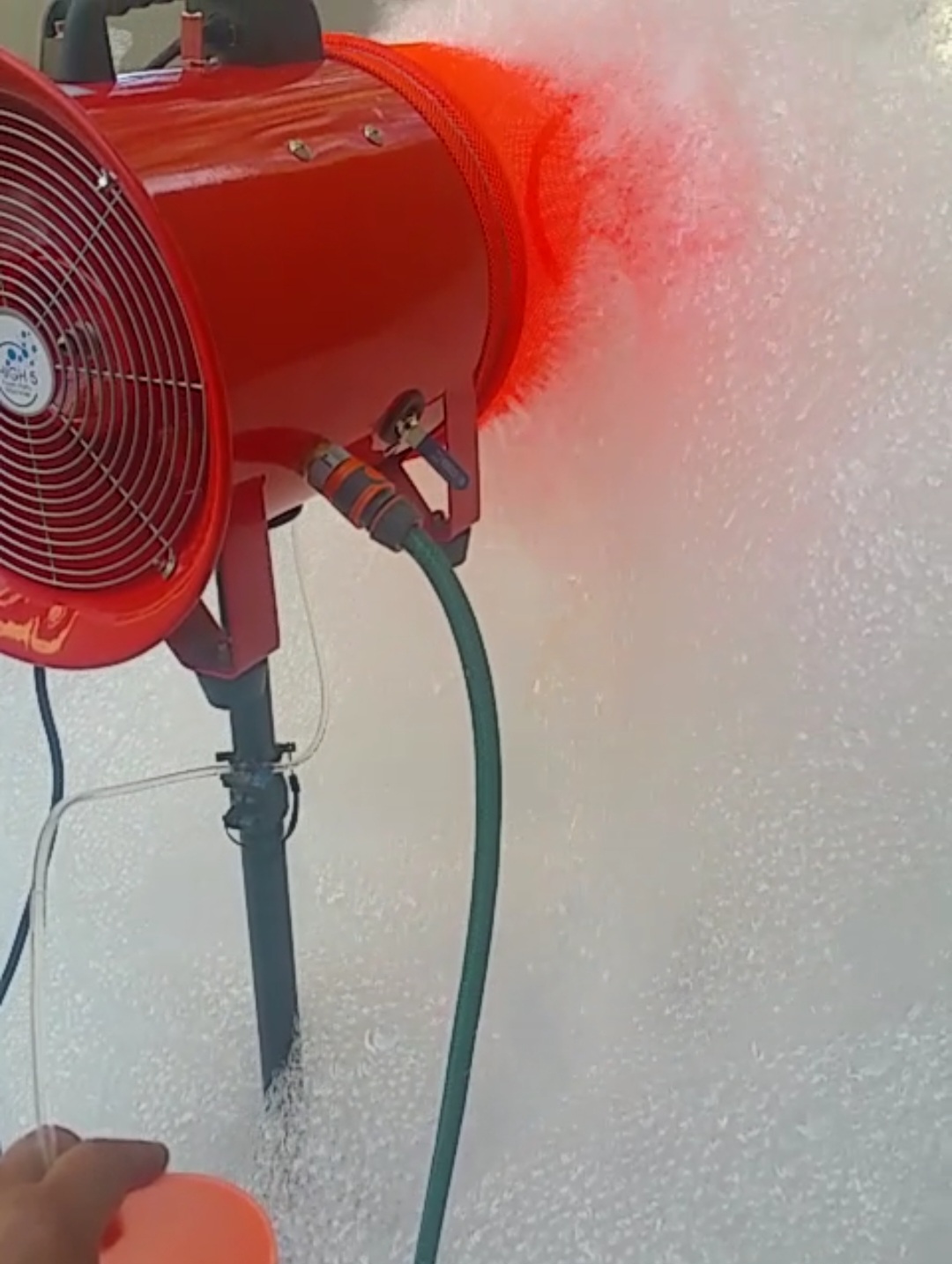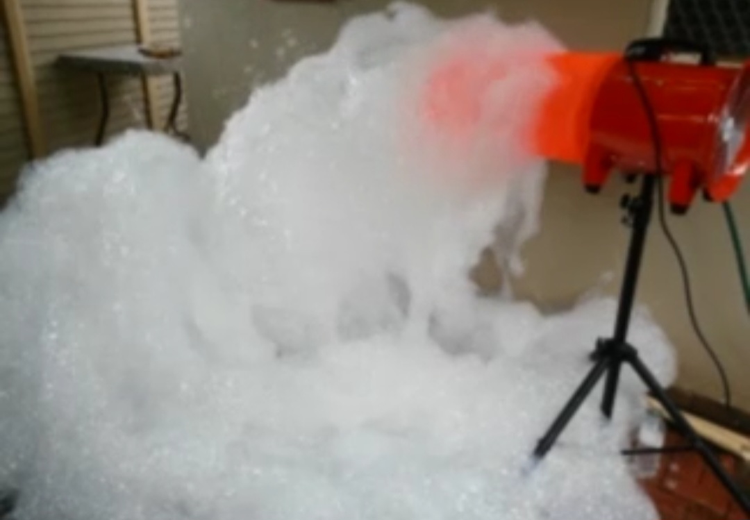 Put the machine on the tripod stand. Attach your hosepipe. Insert a pipe in the foam fluid. And you will have plenty of foam in seconds, for kids and adults to play inside.