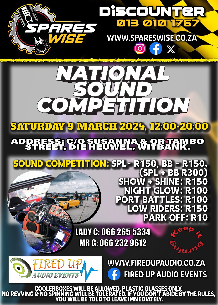 Gear up for an electrifying day filled with roaring engines and thumping bass as Fired Up Audio Events, in collaboration with Spares Wise Discounter, brings you the most anticipated Vehicle Sound Competition of the year!