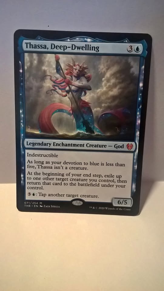 This is a beautiful Mythic Rare copy of Thassa, Deep-Dwelling from the Theros Beyond Death (THB) set. She's a legendary enchantment creature that offers incredible value in blue decks, allowing you to repeatedly exile and return your creatures to trigger enter-the-battlefield abilities. Indestructible and difficult to remove, Thassa also has an activated ability to tap another target creature. A must-have for Commander or any blue-focused deck!