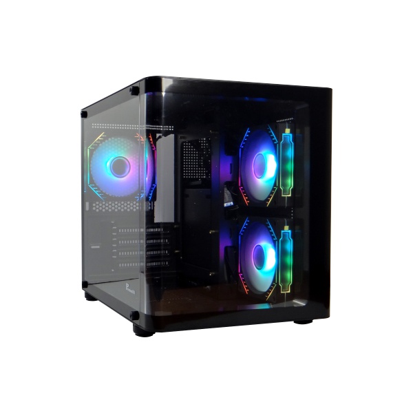 Black cube shaped gaming PC case with a curved corner between a front transparent acrylic panel and side tempered glass panel the that allow you to see into your set-up. This case comes with 3x 12cm ARGB fans. Plenty of ventilation supplies the system with plenty of air to keep it cool and stable for those heavy gaming, studying or even chilled sessions. It supports a 320mm graphics card and has bottom placement for the power supply. The case has great cable management behind the right panel keeping it neat, clean and organized. Supports 7x 12cm fan placement options that ensure a constant flow of cool air. A magnetic removable dust filter ensures the set-up is clean and prevents any damage to your hardware. Minimalist and beautiful design that makes it a show stopper to anyone who see’s it.