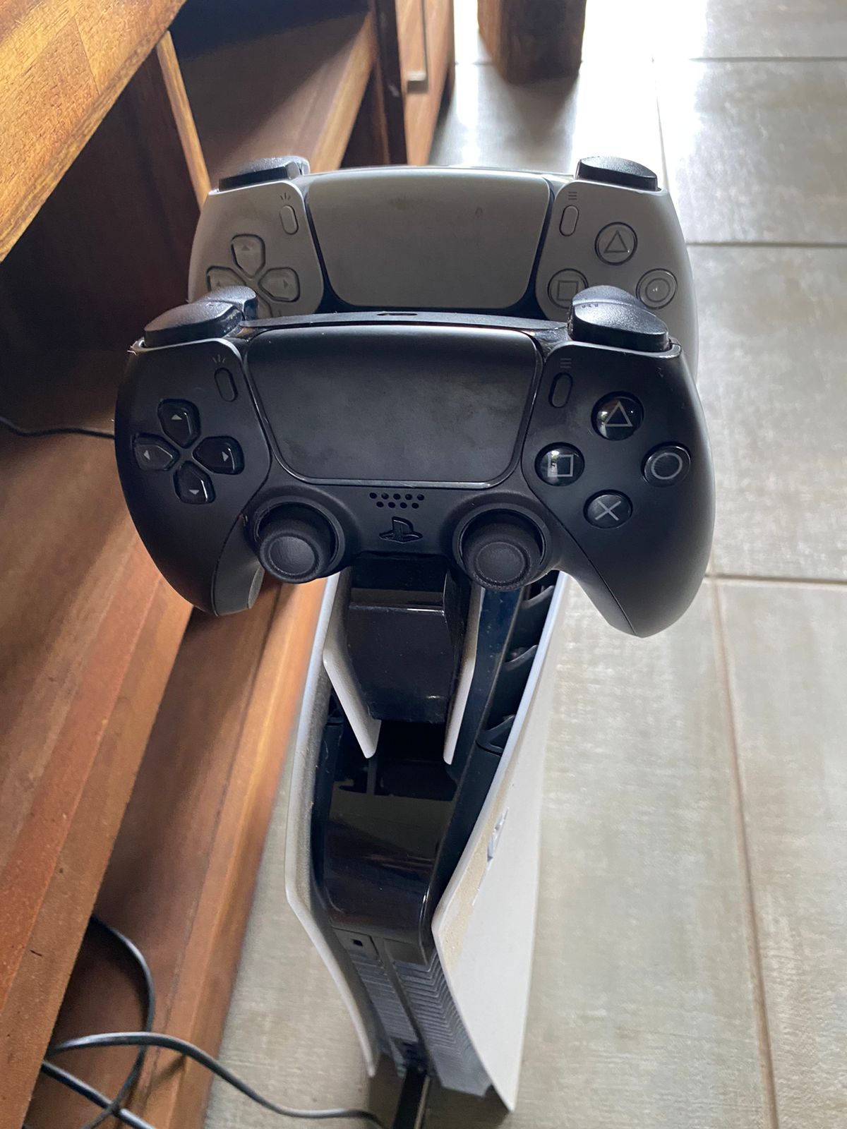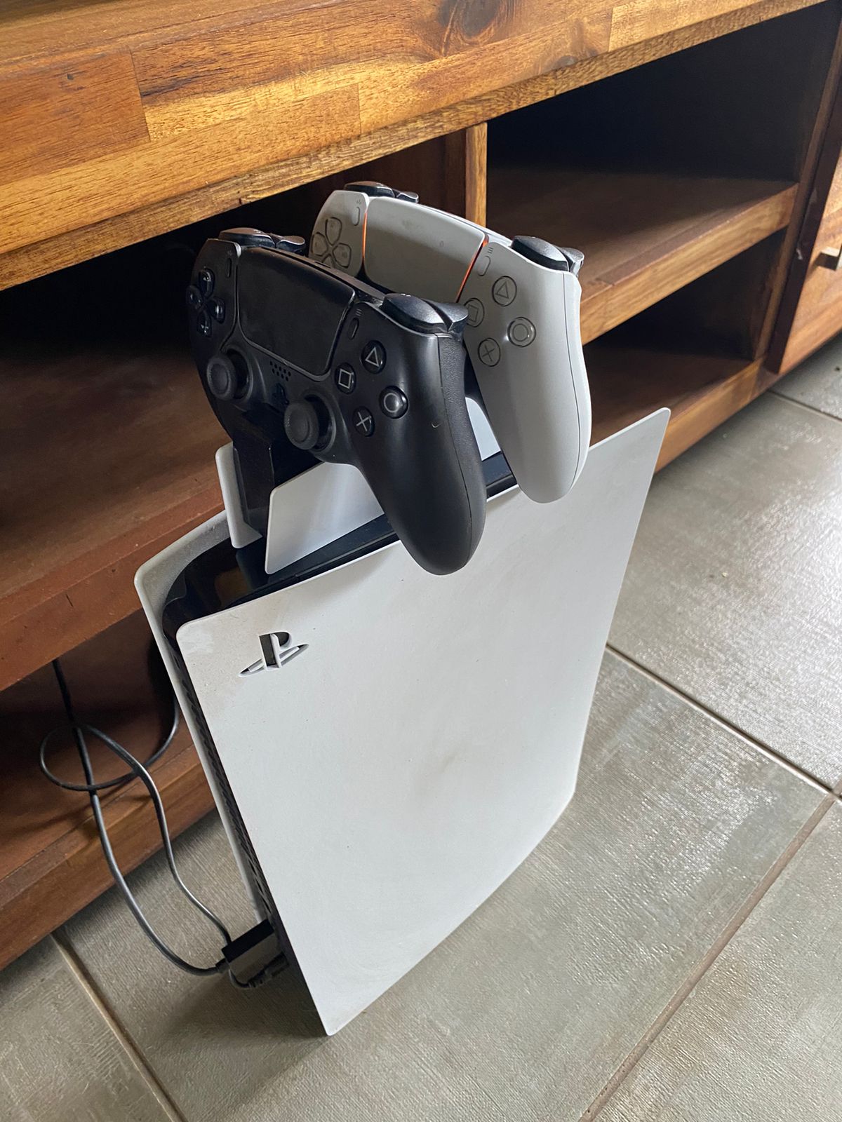 PlayStation 5 with 2 controllers and controller charging dock. More details: