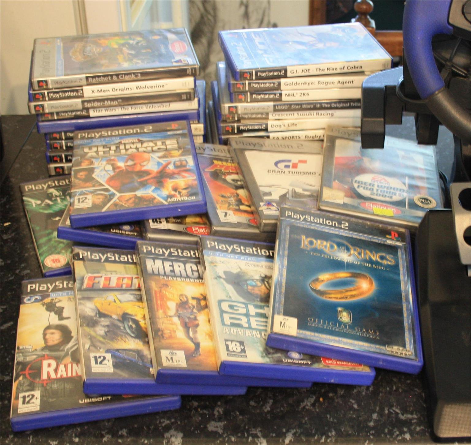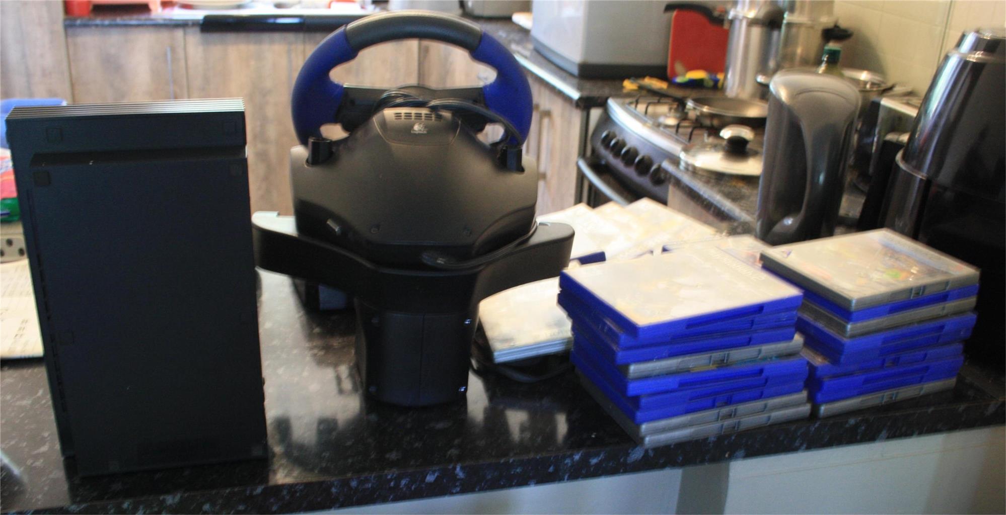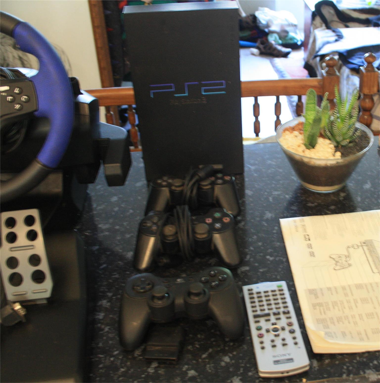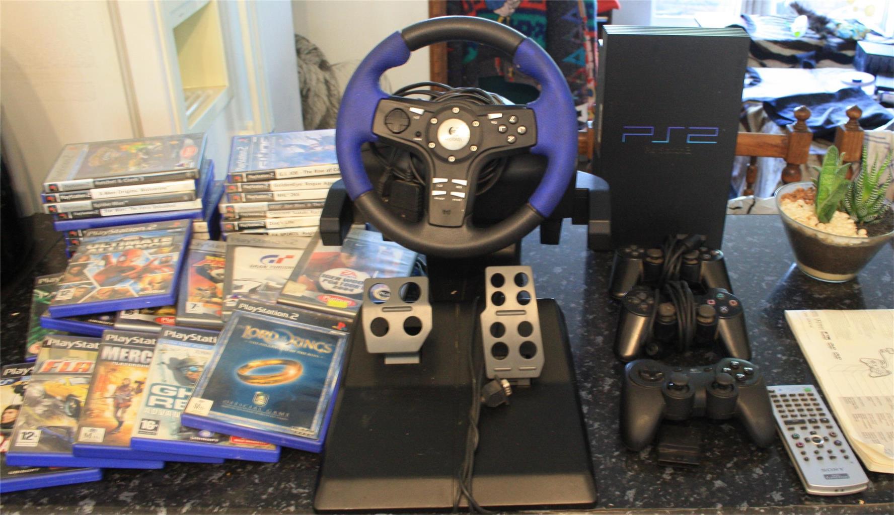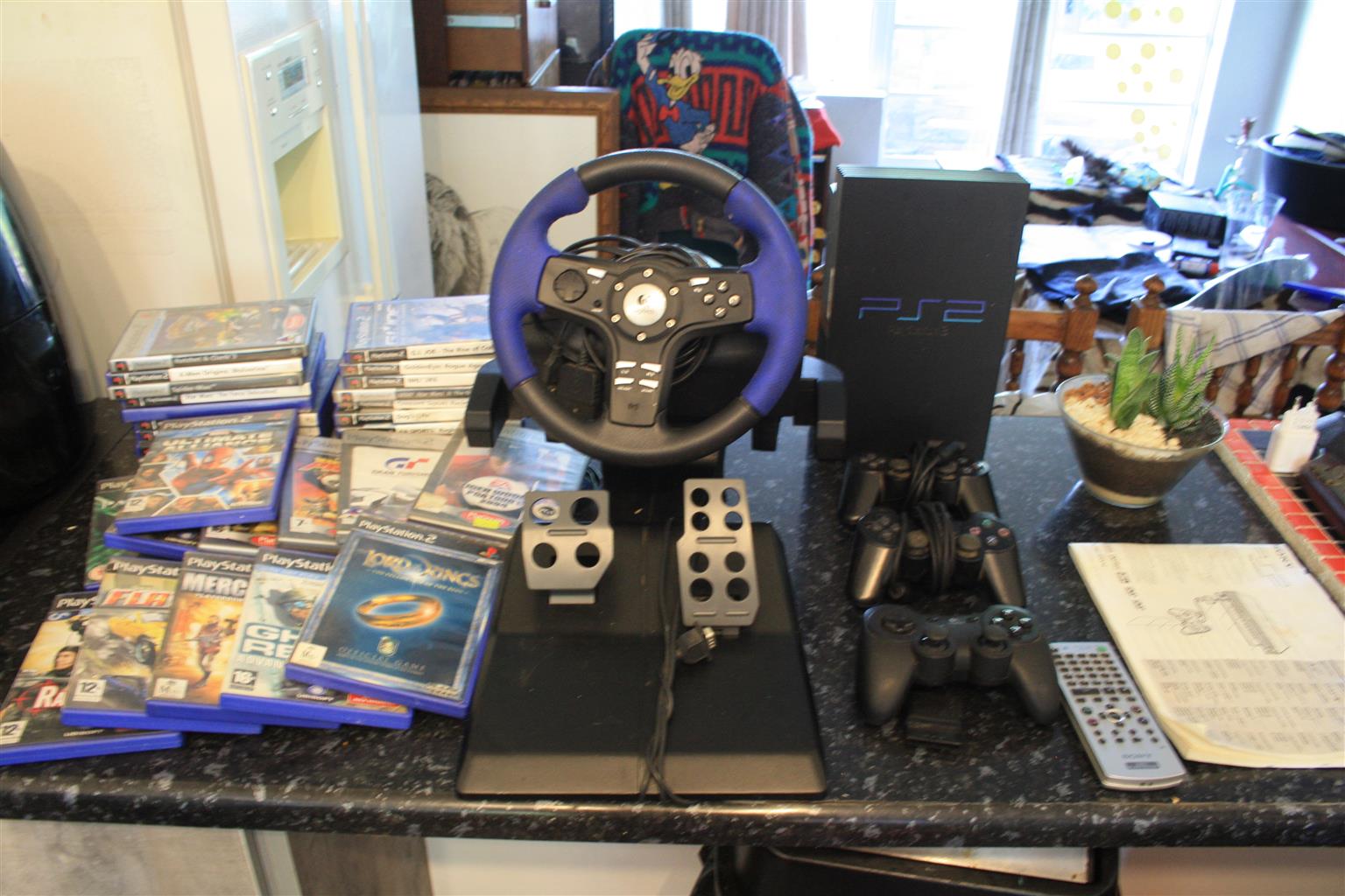 PS 2, consol with 3 x controllers (1 wireless), 31 games, racing steering wheel, racing pedals, inst. manual, remote for consol