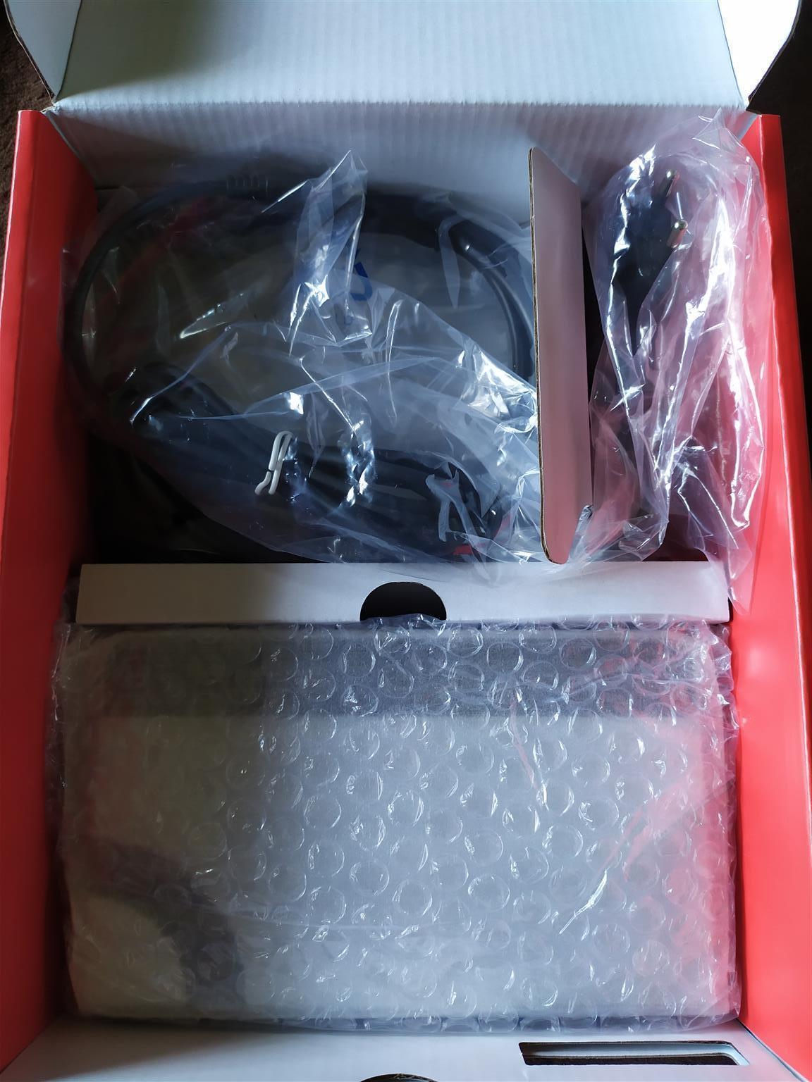 It's box has only been opened once to confirm that it works perfectly once I received it earlier this month.