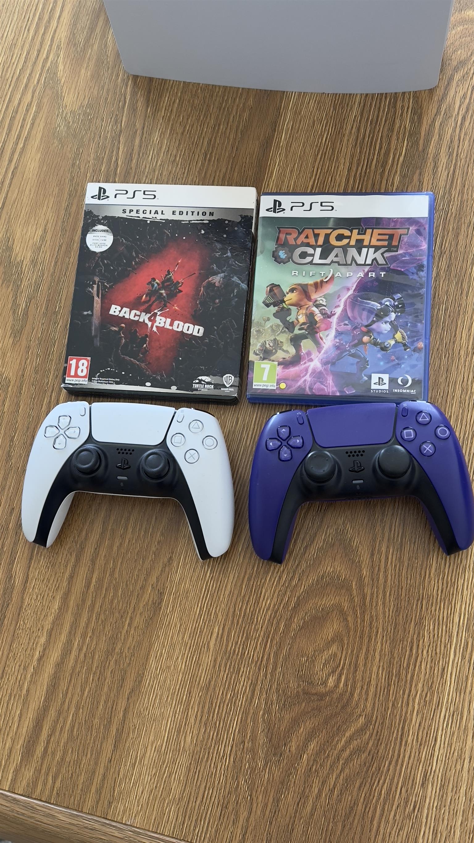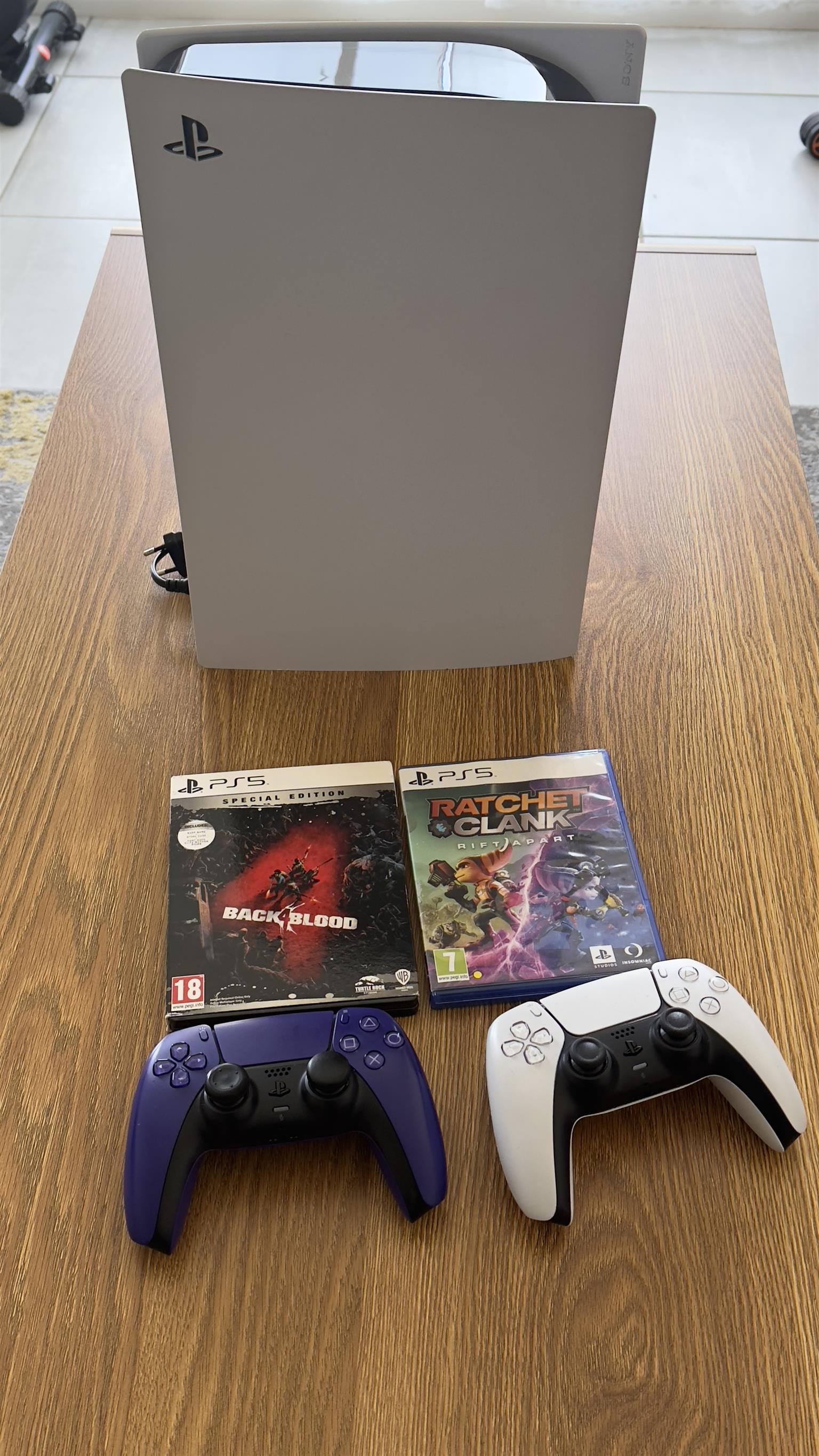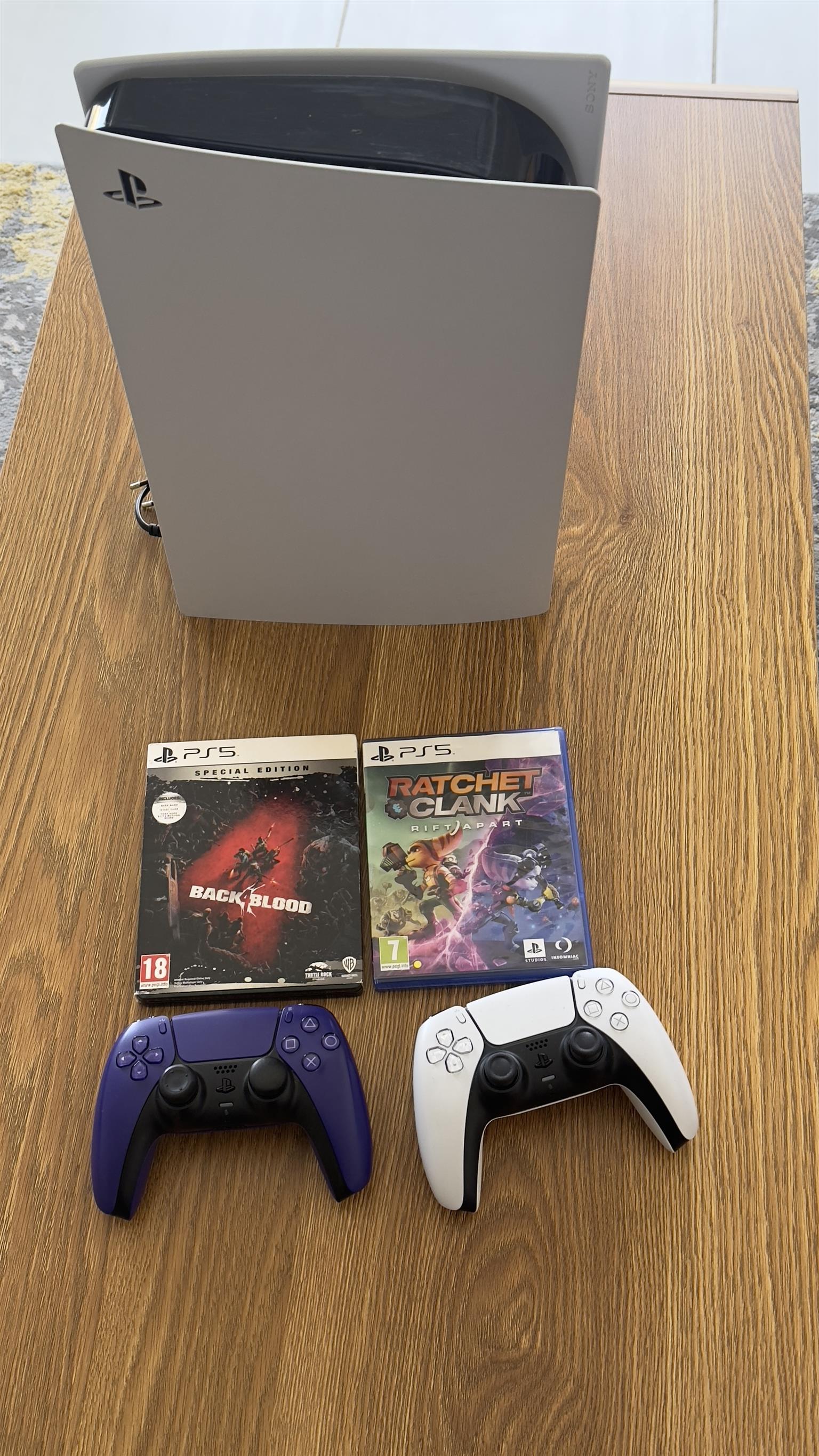 PS5 console for sale. It comes with 2 controllers (the white one has stick drift but the purple one works perfectly) and 2 games, namely Ratchet and Clank Rift Apart and Back 4 Blood. Price is negotiable
