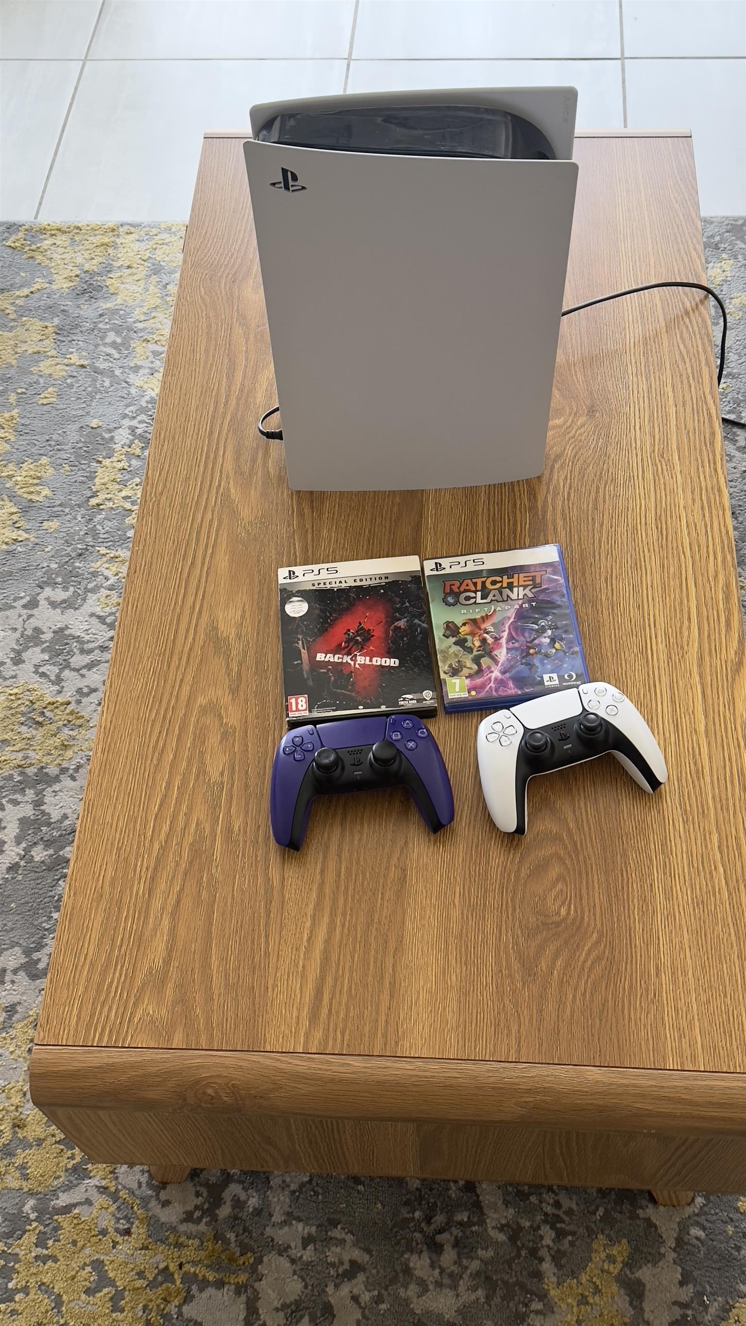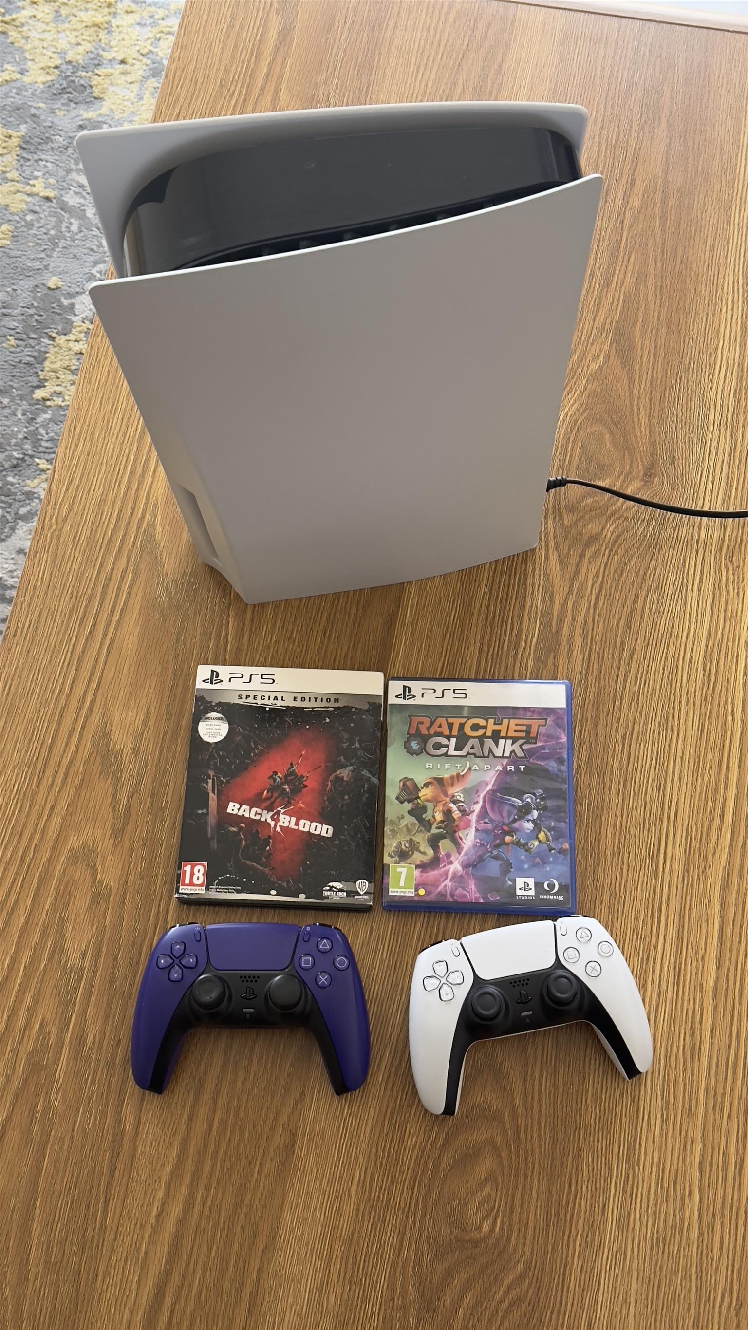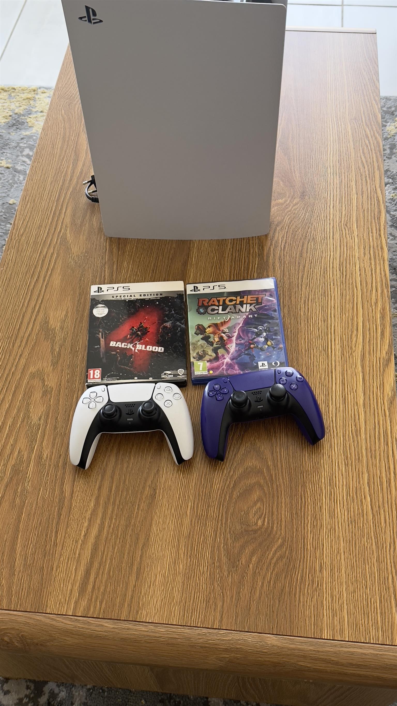 PS5 console for sale. It comes with 2 controllers (the white one has stick drift but the purple one works perfectly) and 2 games, namely Ratchet and Clank Rift Apart and Back 4 Blood. Price is negotiable