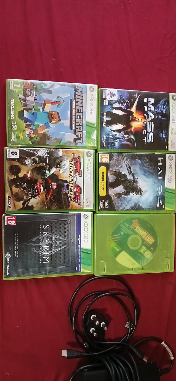 Selling X box 360 with 2 remotes, power supply, Hdmi cable and 6 great games. One remote needs rear battery cover. Reason for selling we upgraded to X box 1.