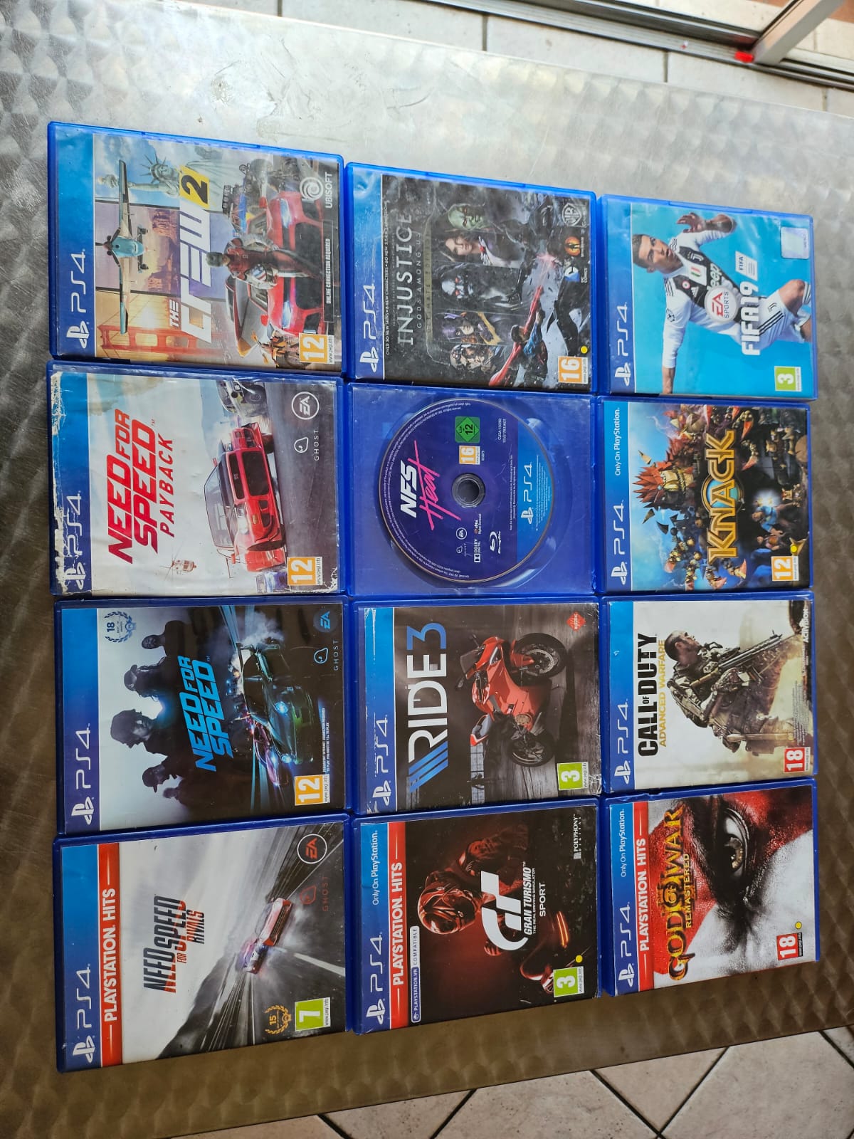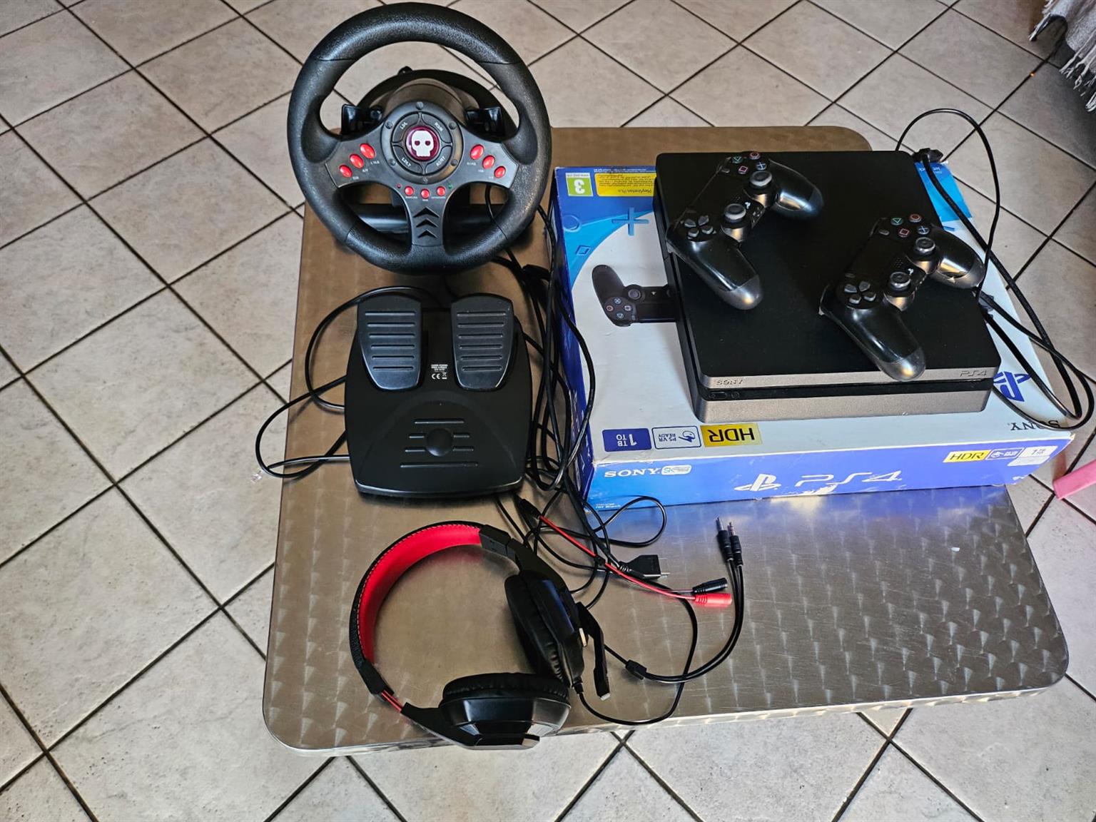 PlayStation 4 slim 1 TB with two controllers,a steering wheel set and gaming headphones and 14 games