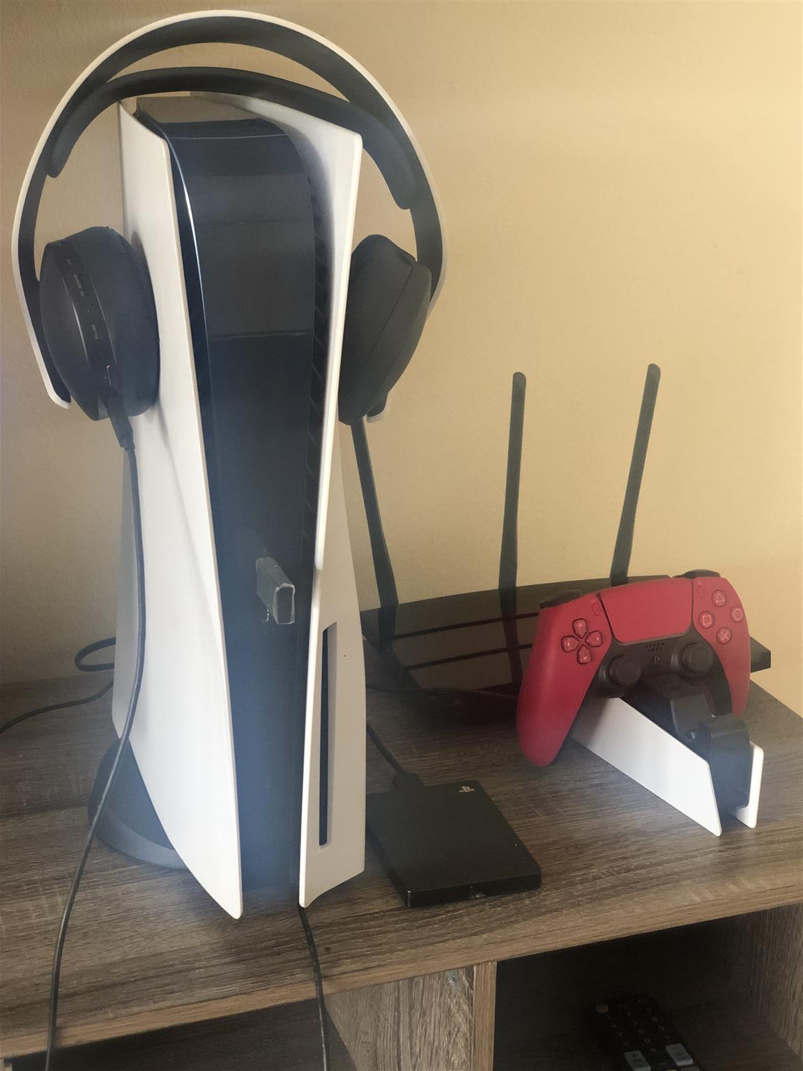 PS5 console comes with x2 controllers, docking station, 3D headset abit worn out on fabric.