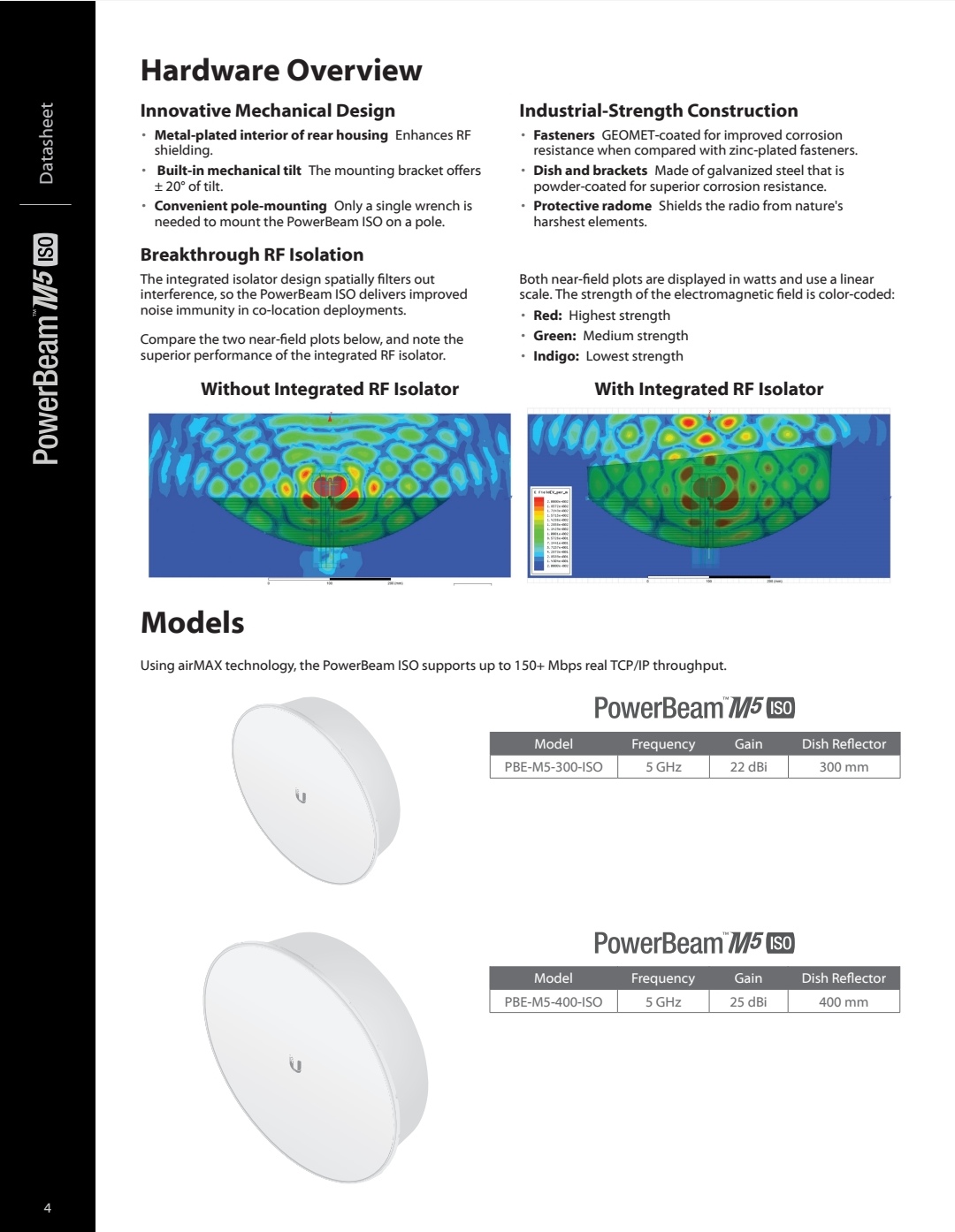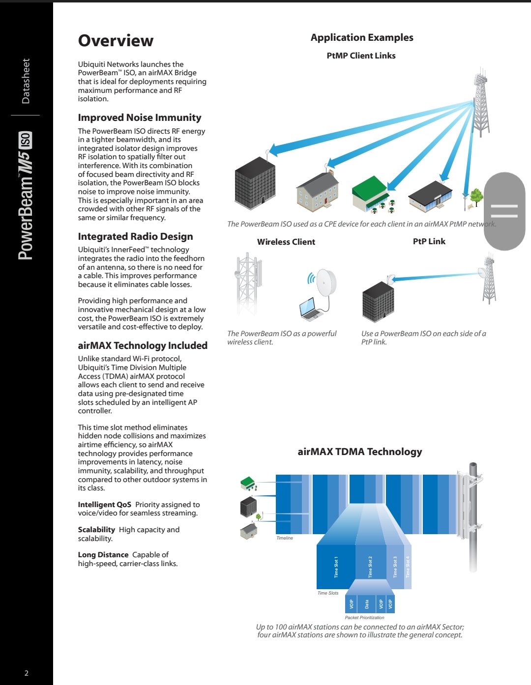 The PowerBeam®M5 400 ISO is an airMAX M series bridge that directs RF energy in a tighter beamwidth, and its integrated isolator design improves RF isolation to spatially filter out interference. With its combination of focused beam directivity and RF isolation, the PowerBeam ISO blocks noise to improve noise immunity.