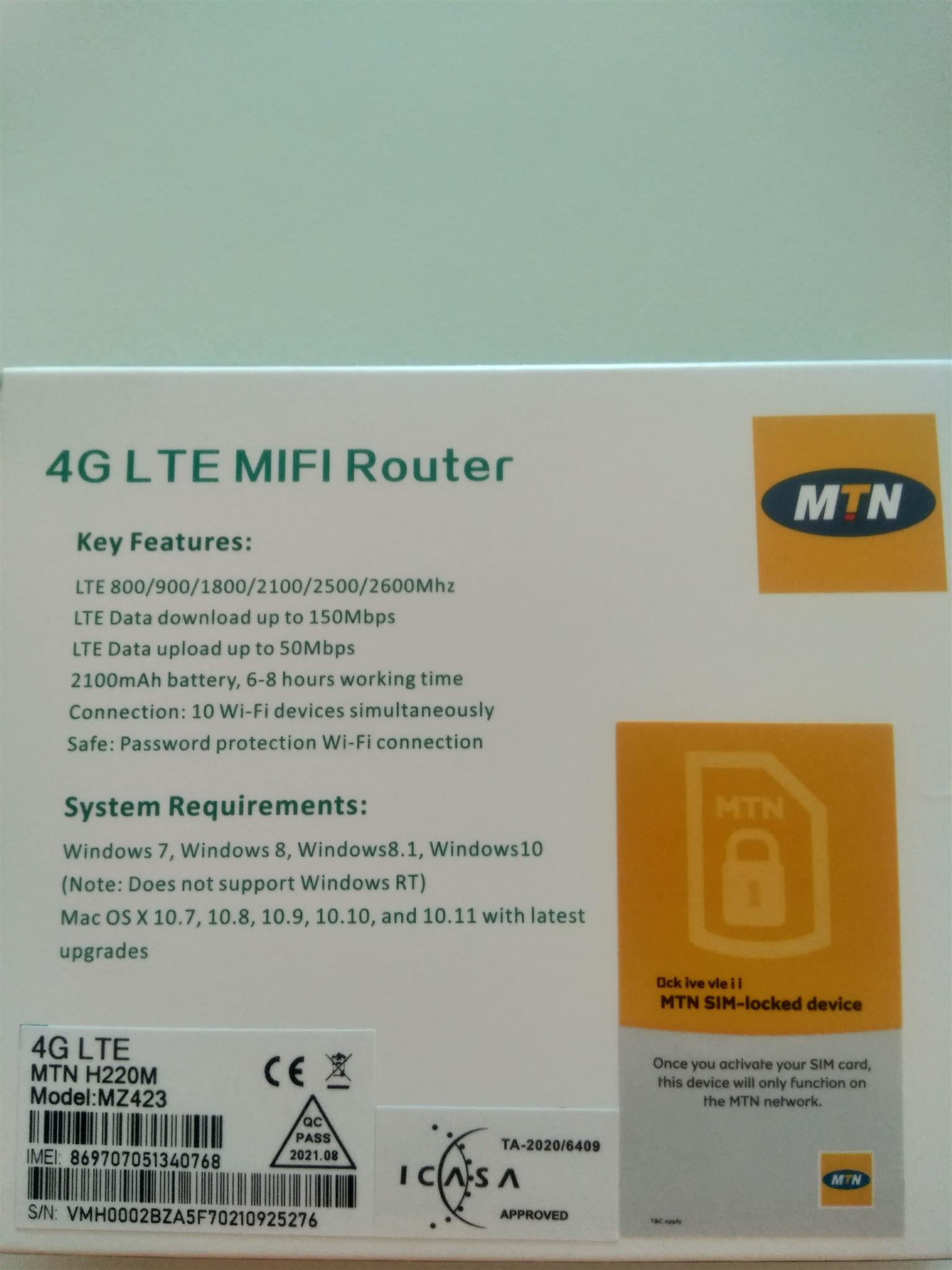 4G MIFI Router te koop hy is nog splinternuut rede vir verkoop ons gebruik hom nie. Hy is MTN sim locked.