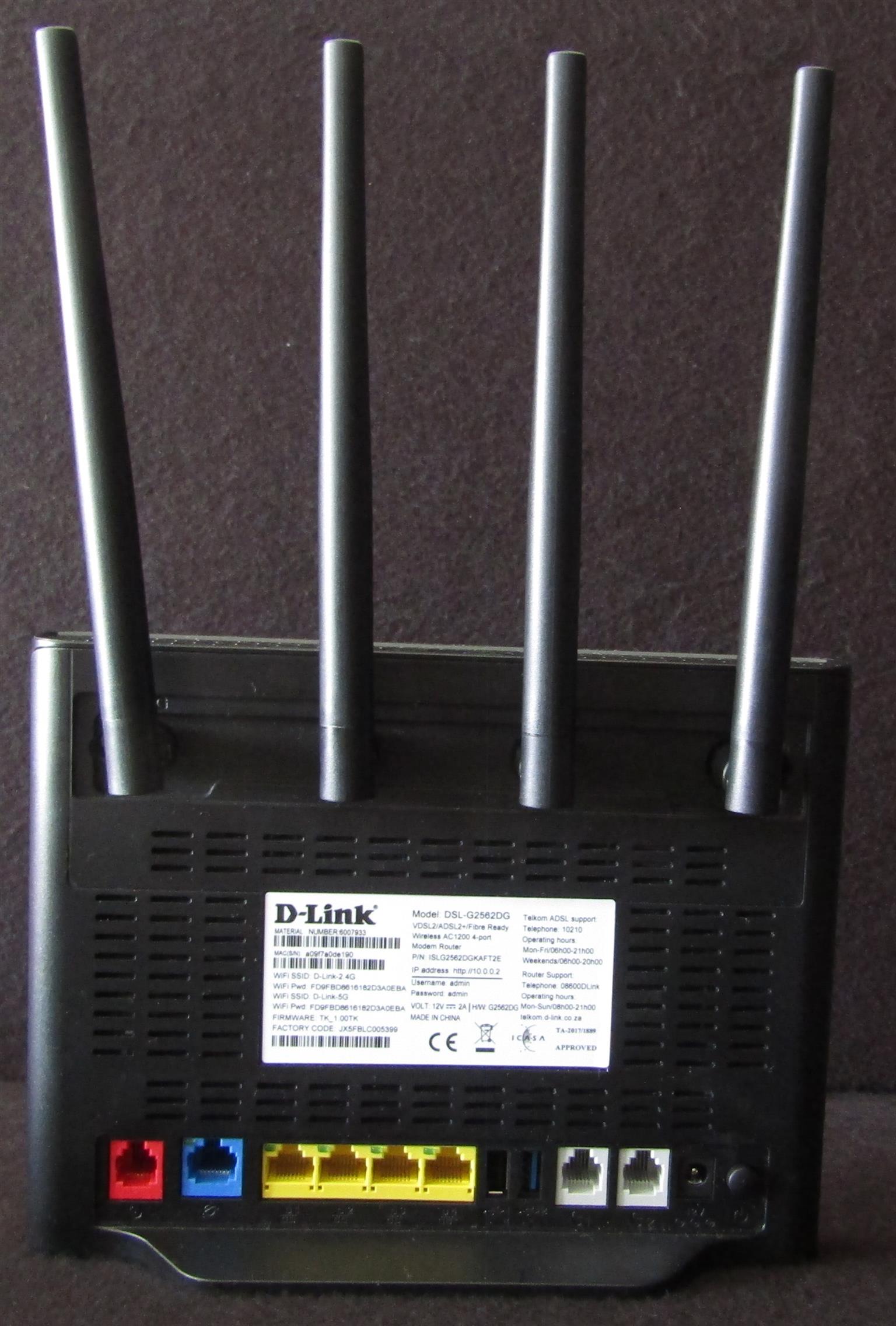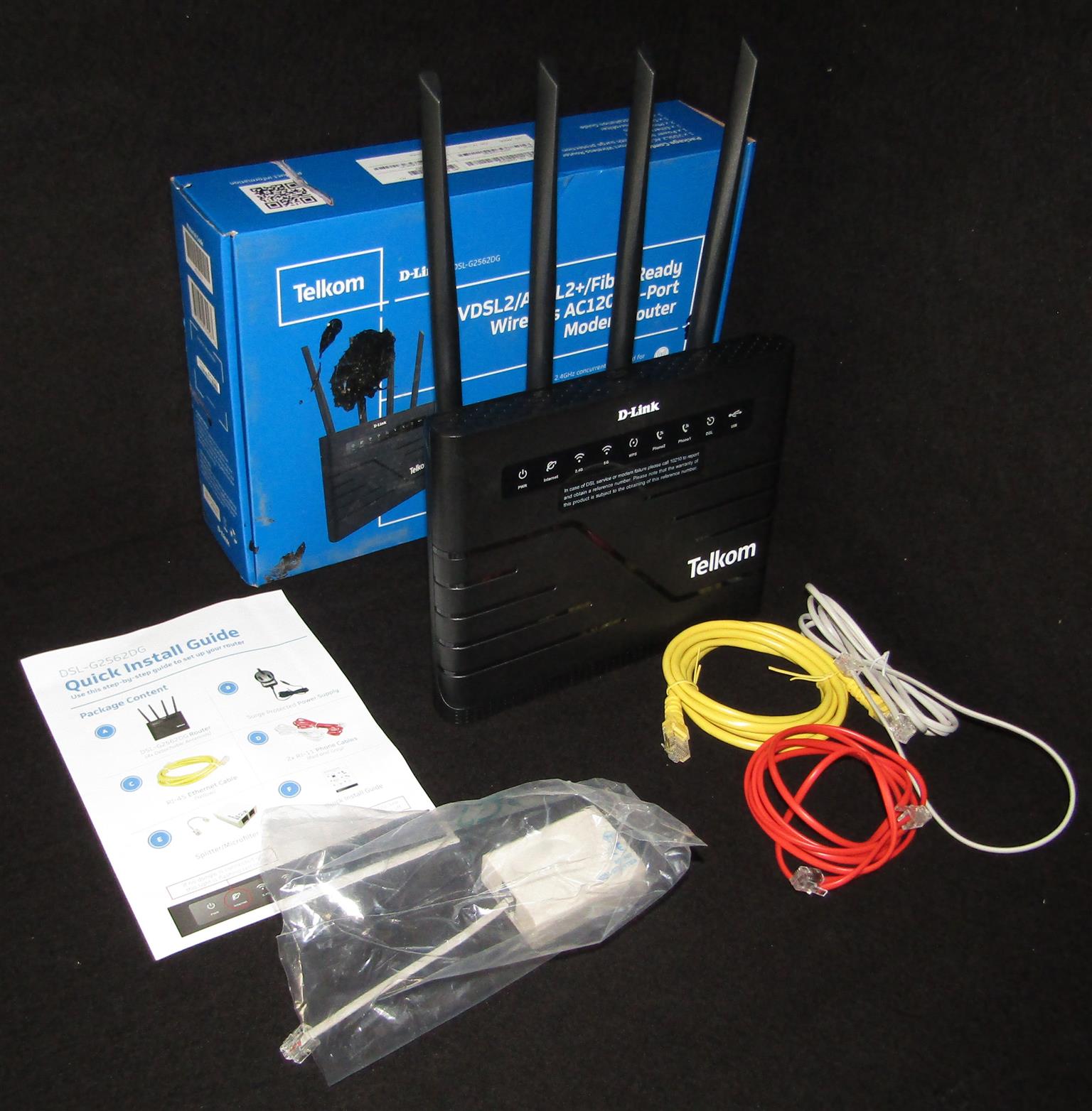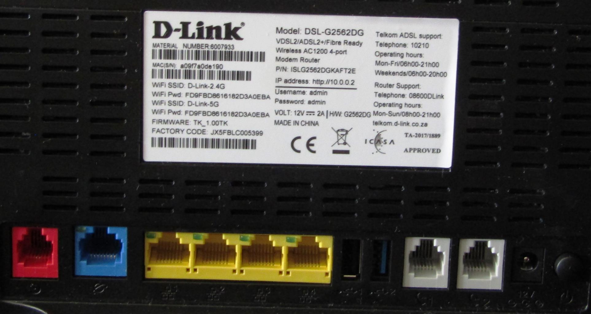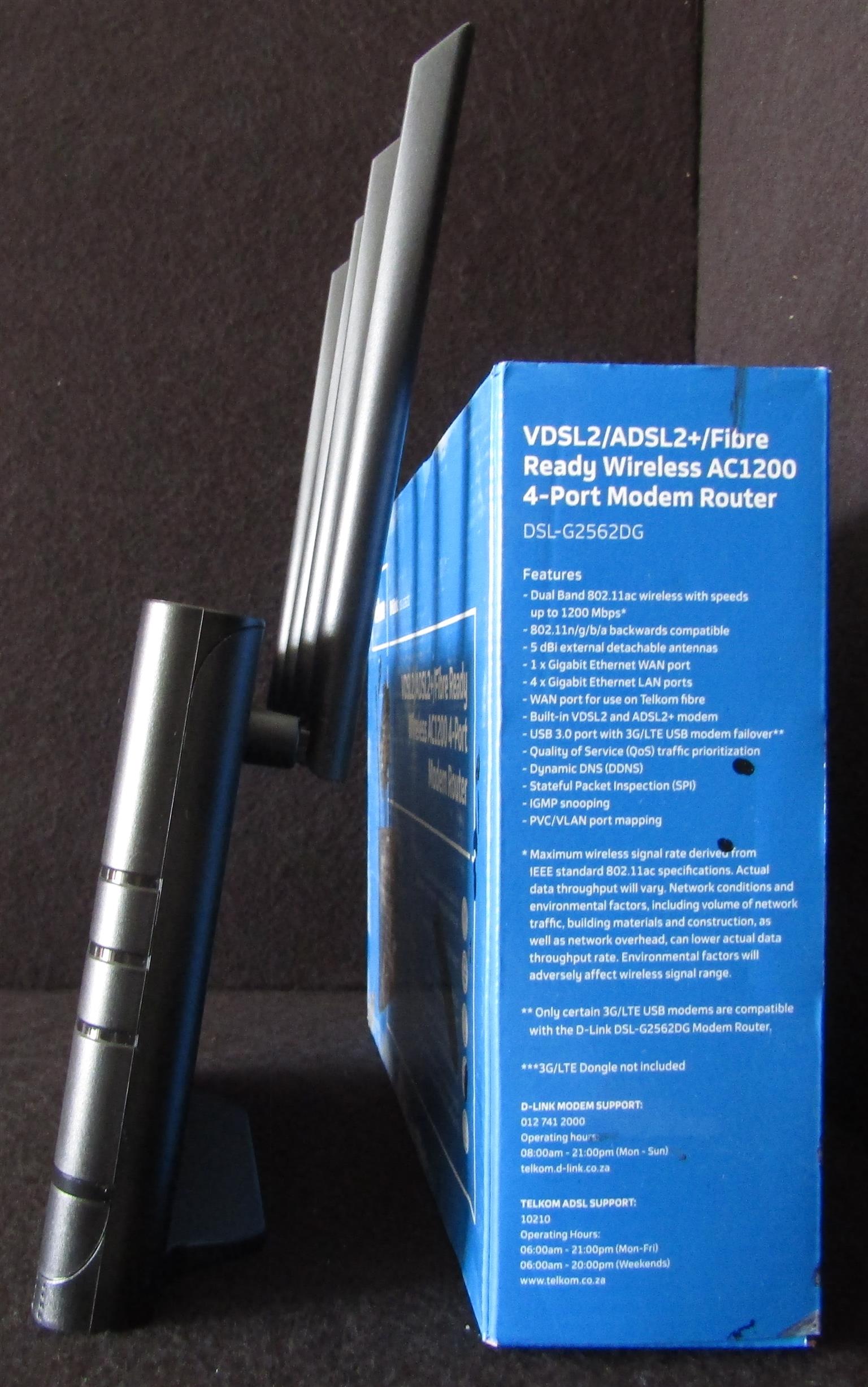 Item used but still in good condition. For specs, see: https://www.d-link.co.za/product/dsl-g2562dg-tk2/