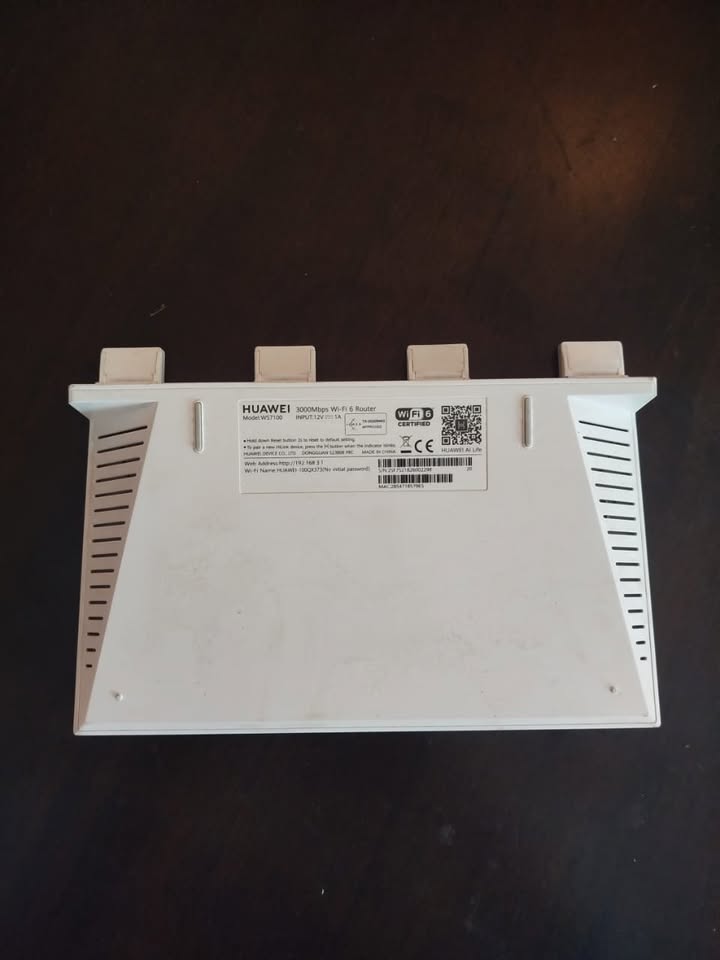 Selling my used Huawei AX3 Dual-Band WiFi Router. It's in perfect working condition and excellent physical shape. I've upgraded my mesh system, so this reliable performer is looking for a new home. This is a fantastic router for getting strong, fast WiFi coverage throughout your apartment or house. It works perfectly with all major South African fibre providers (like Openserve, Vuma, Frogfoot, Afrihost, etc.). Key Features: Wi-Fi 6 Ready: Supports the latest Wi-Fi 6 technology for faster speeds and better performance with multiple devices. Dual-Core Processor: Handles multiple connections smoothly—perfect for streaming, gaming, and working from home. Dual-Band Speed: Delivers speeds up to 3000 Mbps (5 GHz: 1201 Mbps + 2.4 GHz: 3000 Mbps). Huawei WiFi Plus: Automatically optimizes your signal for a stable and fast connection. Compact & Sleek Design: Easy to place anywhere without being an eyesore. Easy Setup: Manage everything easily through the Huawei AI Life app. Plug and play. What's Included: Huawei AX3 Router Original Power Adapter (Note: No Ethernet cable included, but can be provided if I have a spare) Perfect for: Anyone looking to upgrade their old, slow router. Fibre broadband users. Households with many phones, laptops, and smart devices. Pick-up from Greenstone mall. Please message me if you have any questions!