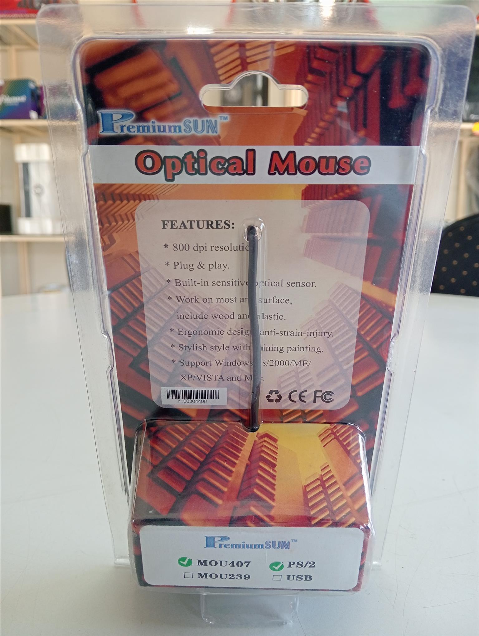 This PremiumSun optical mouse is a PS2 corded ergonomic mouse with a very comfortable finish and stylish orange lining. It features 2 buttons with a clickable scroll.