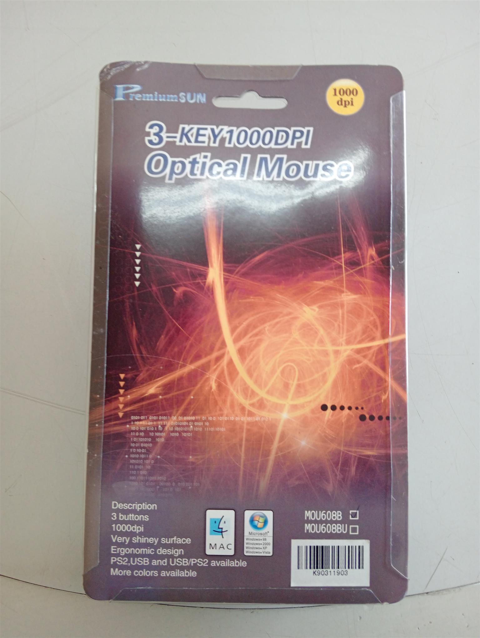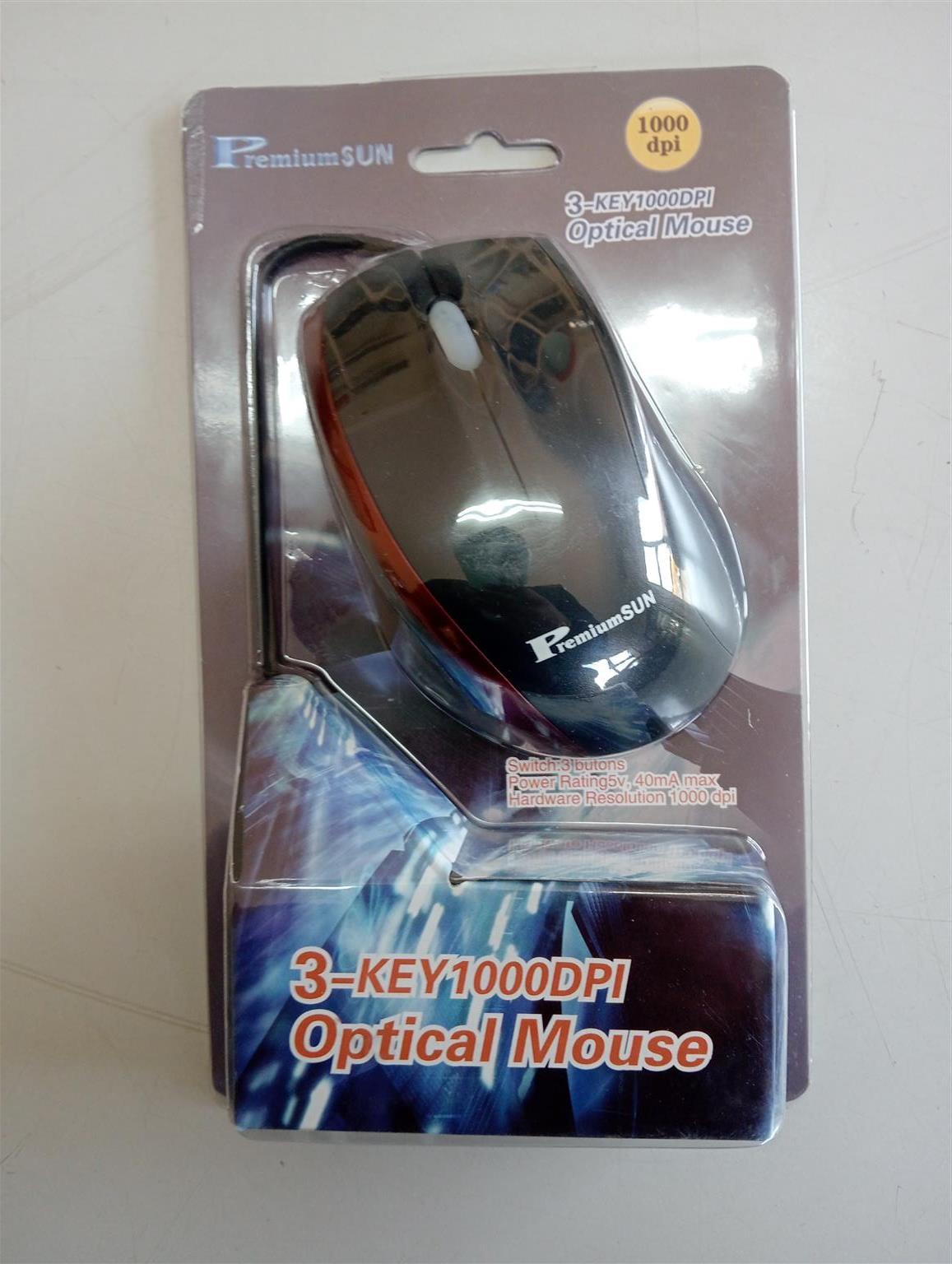 This PremiumSun optical mouse is a PS2 corded ergonomic mouse with a very comfortable finish and stylish red stripe on the left. It features 2 buttons with a clickable scroll.