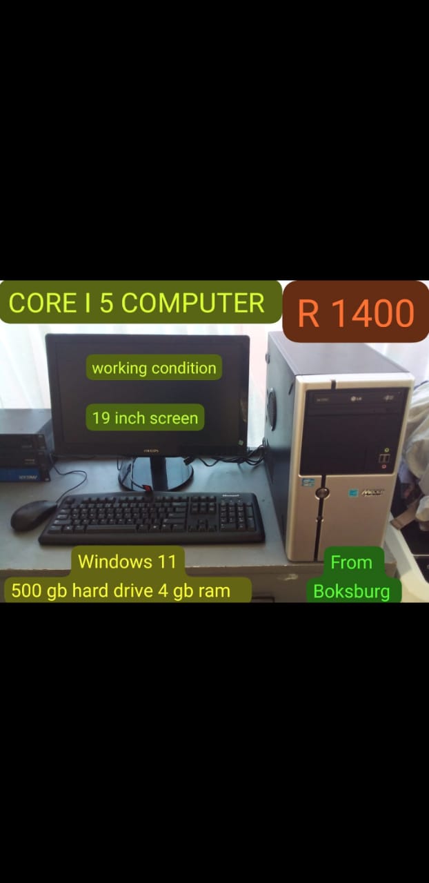 Core i 5 full set computerCore i 5 computer. More details:Intention - For SalePrice - 1400.0Region - GautengCity - Boksburg