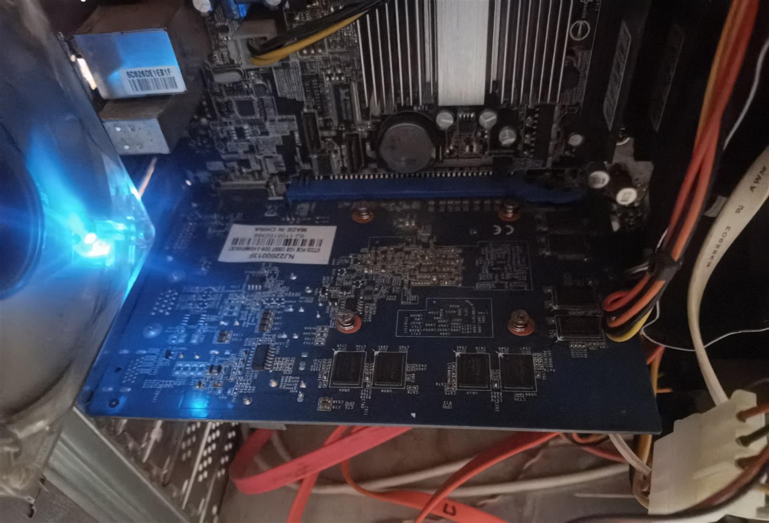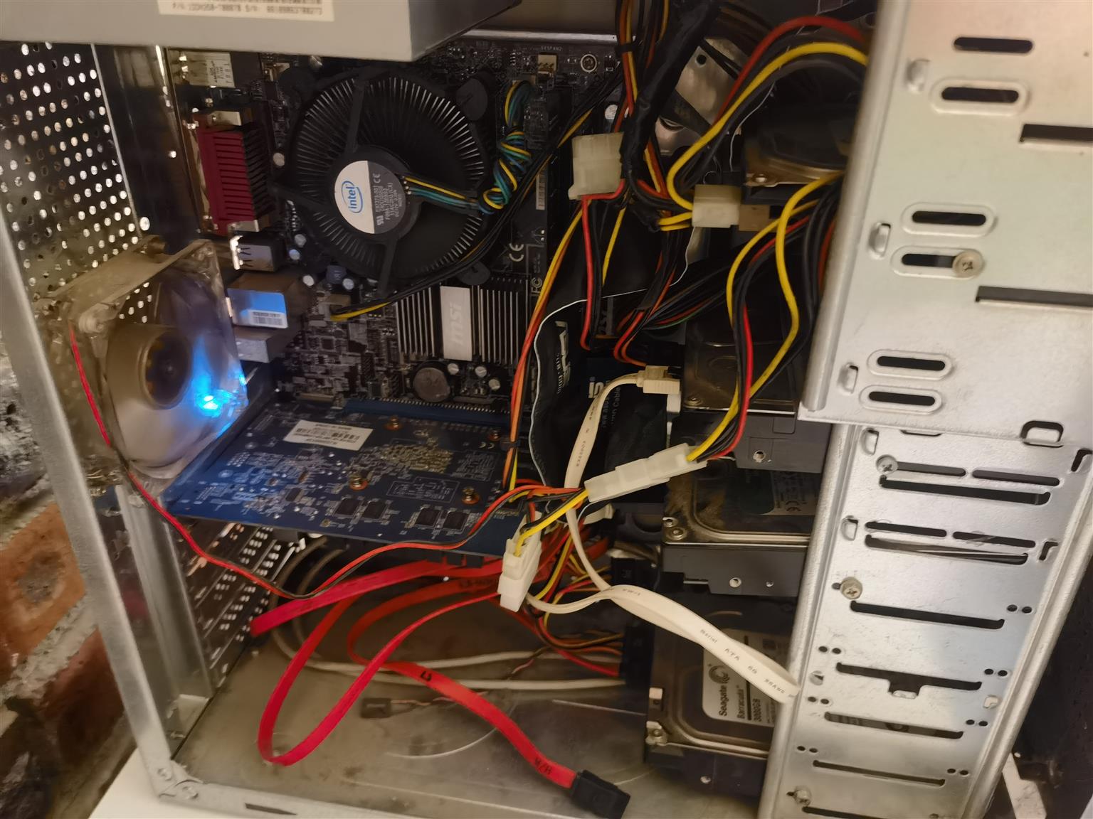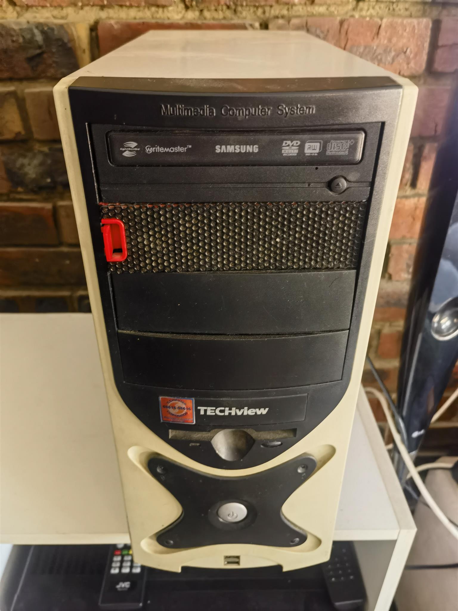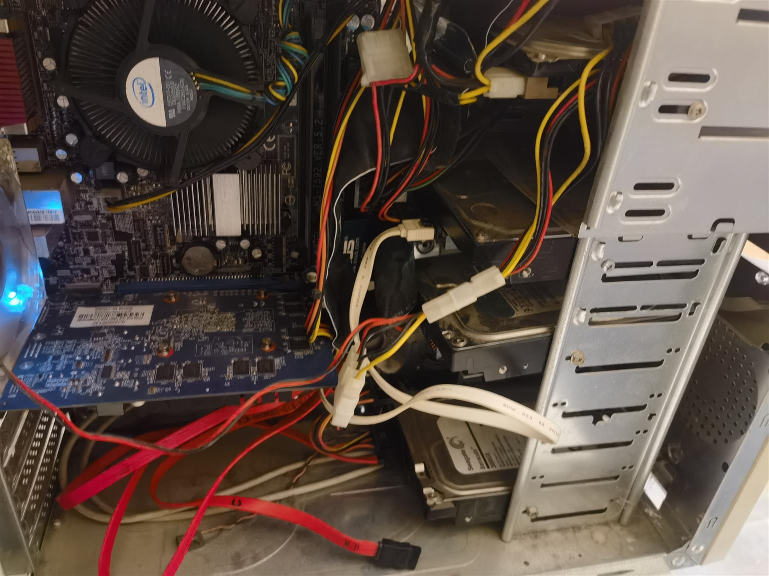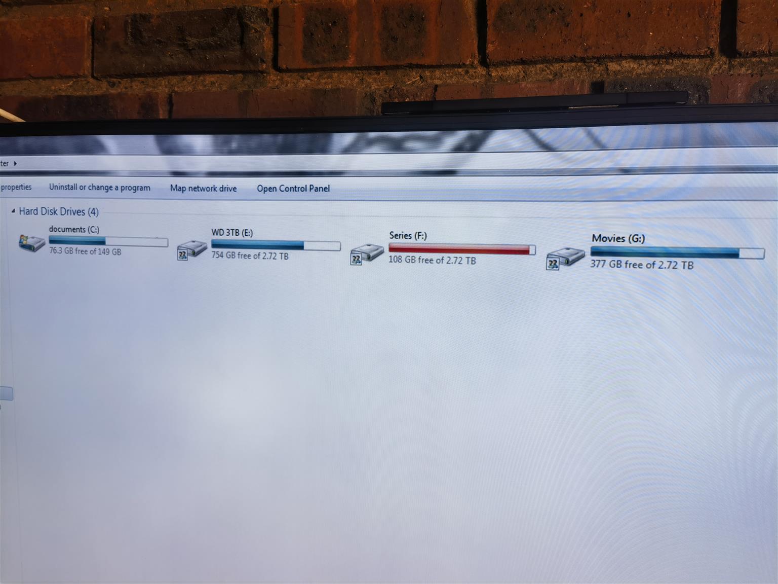 Intel PC with 4gb ram and GT210 screen card. 500gb IDE drive for operating system (Win7), 3 x 3TB drives with movies and series already on. No swaps. Cash on collection