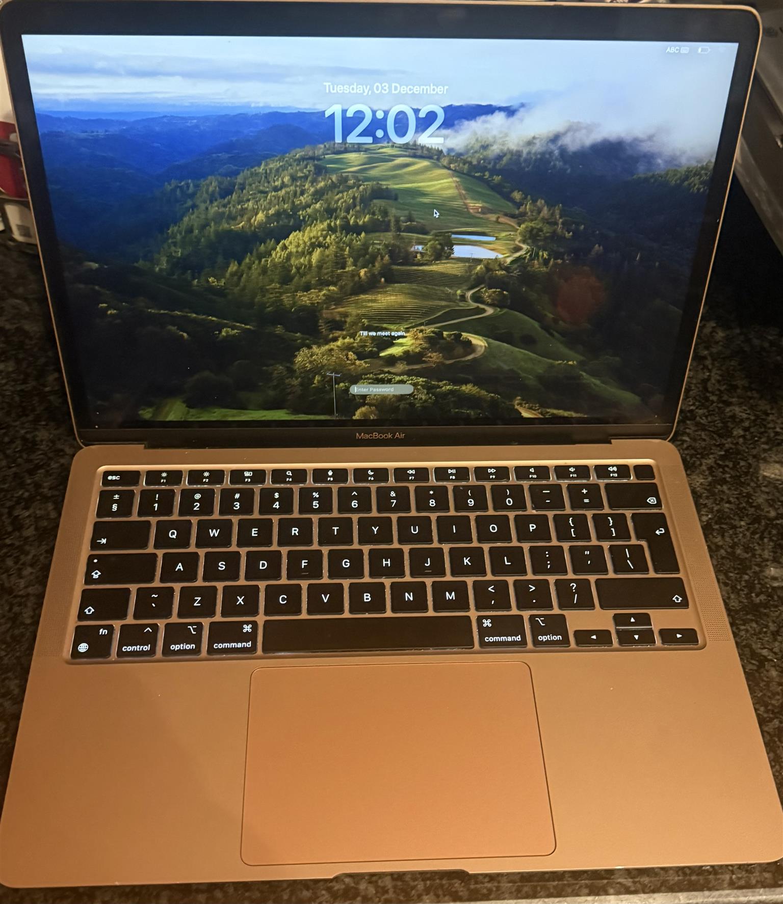 SECOND HAND APPLE MACBOOK AIR, M1, 2020, THE ITEM HAS NO BOX JUST THE LAPTOP AND CHARGING CABLE, IT IS SECOND HAND AND THERE ARE A FEW VISSIBLE MARKS IF ONE LOOKS CLOSELY, BATTERY LIFE IS NORMAL