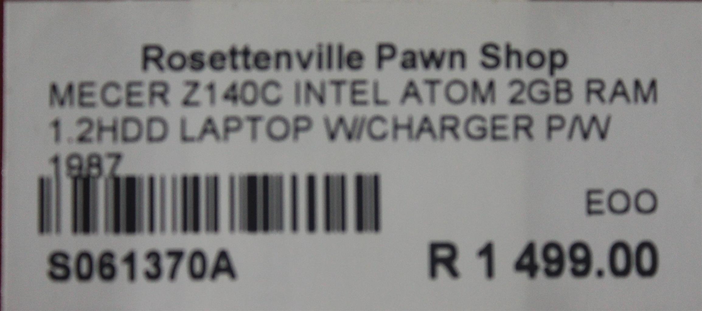 MECER Z140C INTEL ATOM 2GB RAM 1.2HDD LAPTOP W/CHARGER P/W 1987
