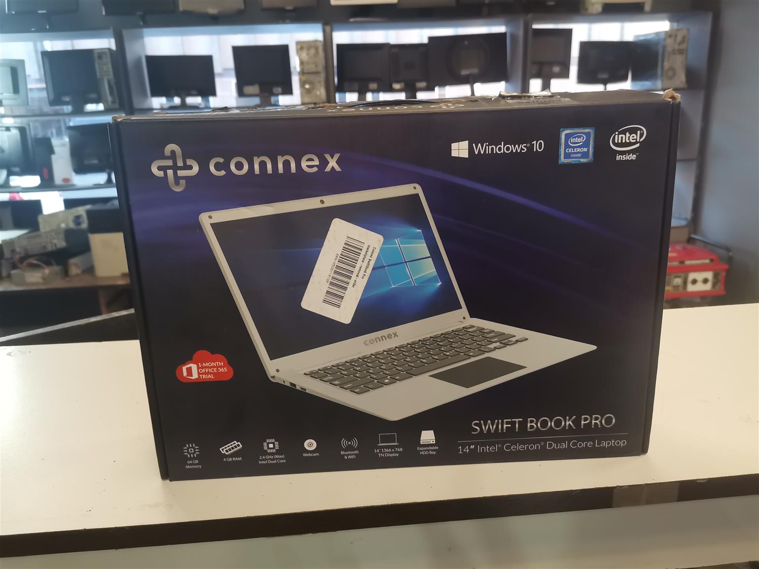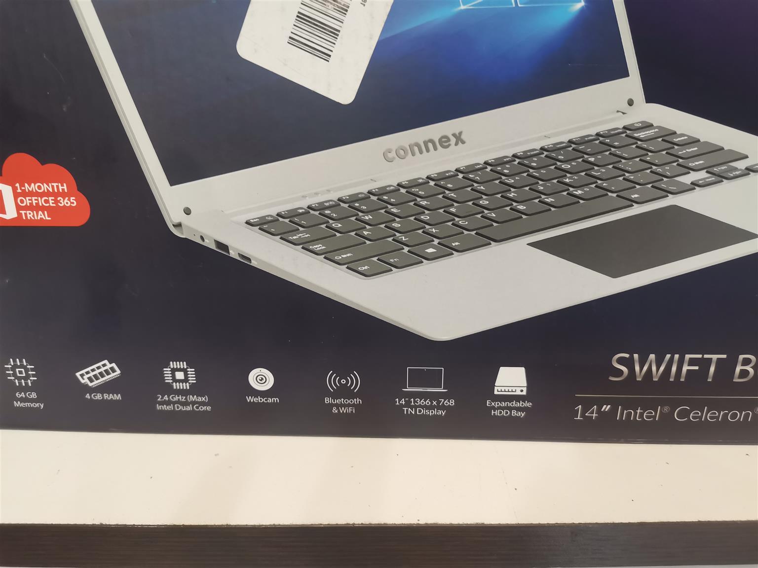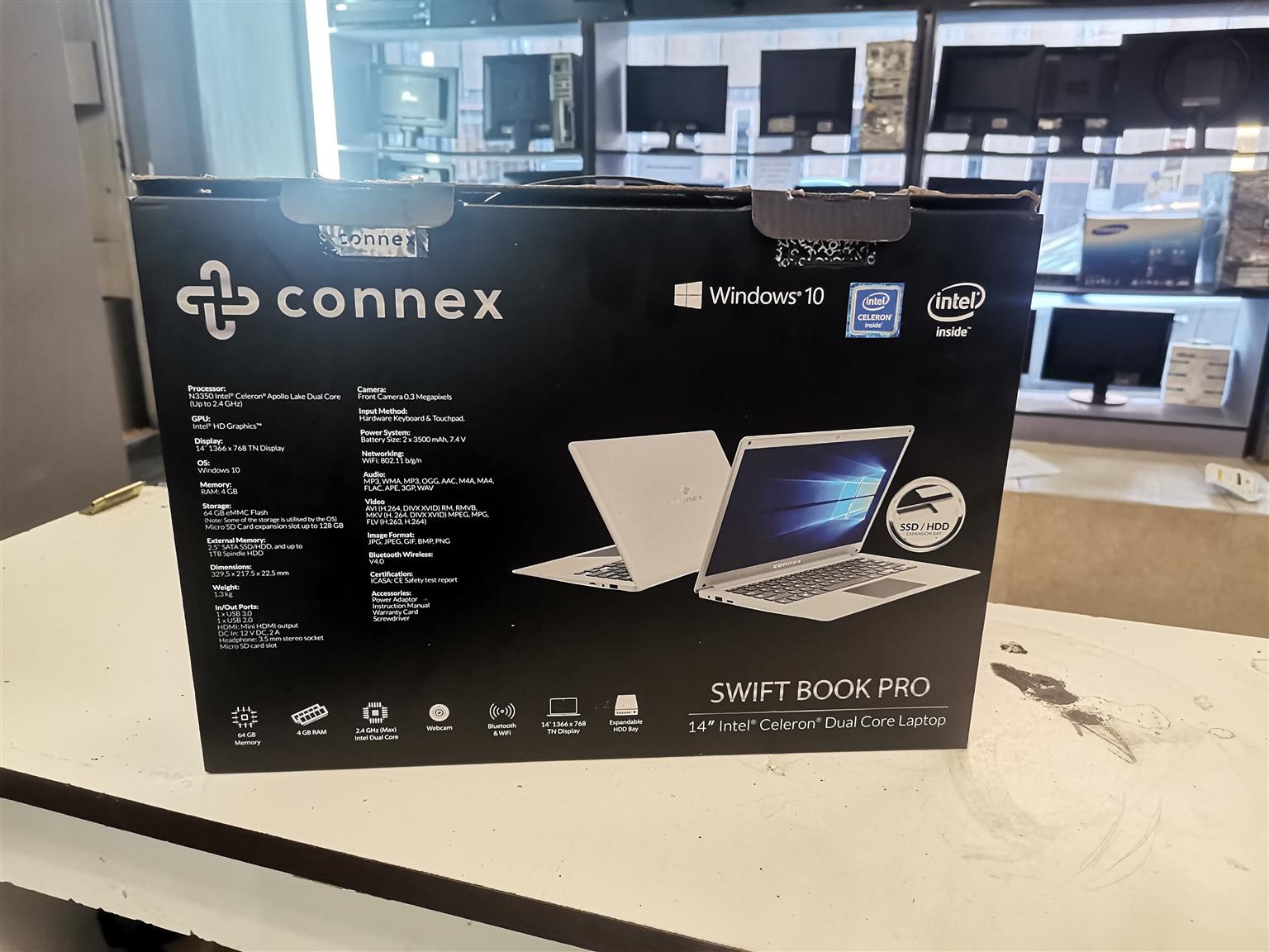 CONNEX SWIFTBOOK PRO,INTEL CELERON DUAL CORE ,64GB ONBOARD DRIVE,EXTENDED HARD DRIVE SPACE,4GB RAM,WIN 10