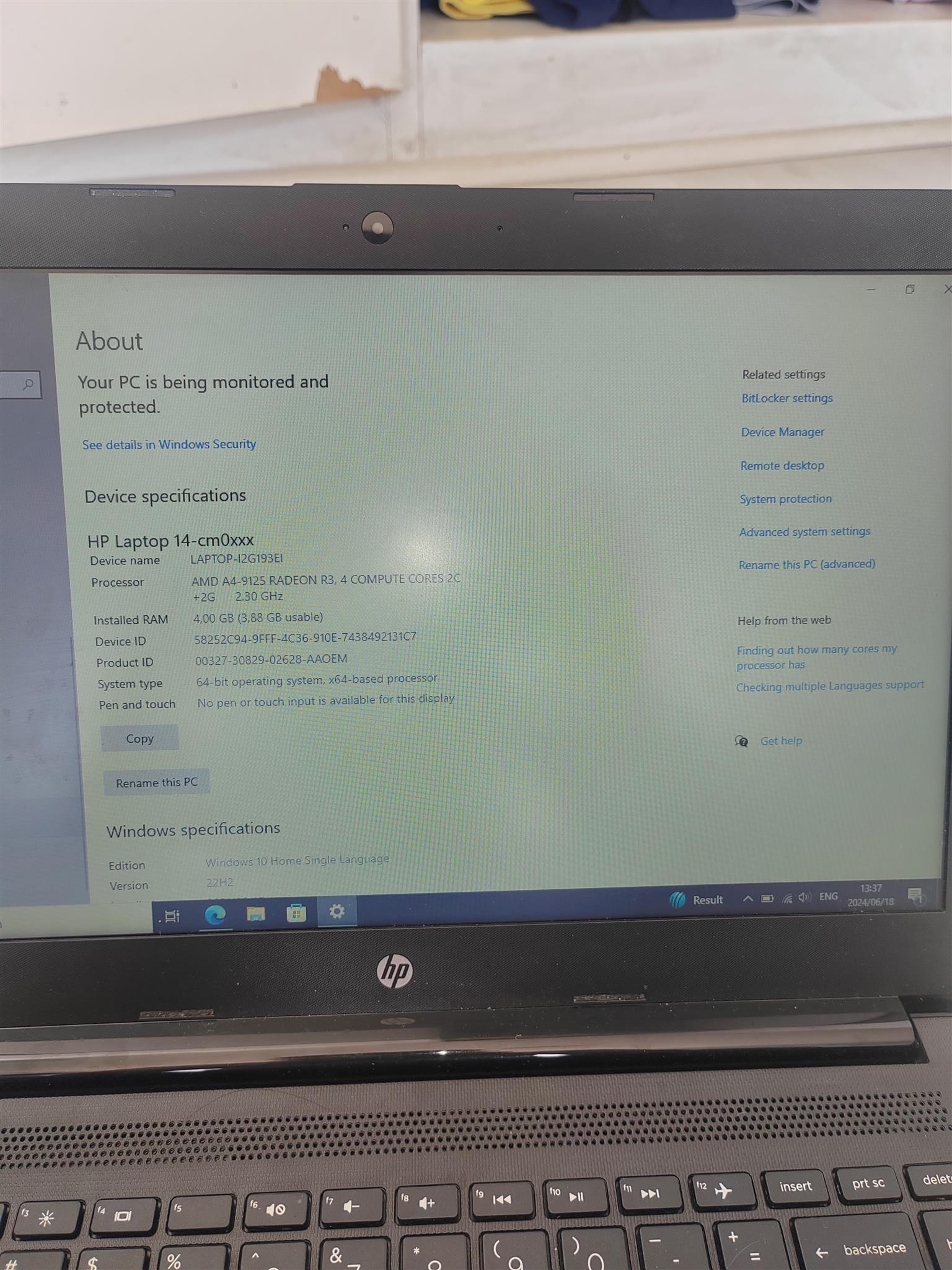 Hp 14 inch laptop. Model code: 14-cm0xxx. 4GB Ram. 60 GB storage. Processor: AMD A4-9125 Radeon. 2.30 GHz.