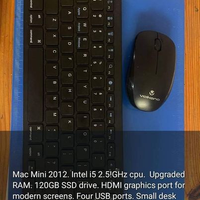 Mac Mini 2012. Intel i5 2.5!GHz cpu. Upgraded RAM. 120GB SSD drive. HDMI graphics port for modern screens. Four USB ports. Small desk footprint. Comes with bluetooth keyboard and infrared mouse. Mac OSX 10.13. Software preinstalled incl libreoffice and Apple Office for MS Office compatibility. Can browse modern websites and produce documents. Can run old copies of Blizzard games. Has VLC installed so can also be media player. Will play movies from Netflix.