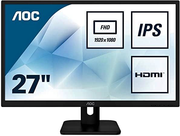 AOC 27" FULL HD MONITOR - Panel Size: 27" / 685.9mm - Panel Type: IPS - Backlight: WLED - Effective Viewing Area (mm): 597.88 (H) x 336.31 (V) - Optimum Resolution: 1920 x 1080 @ 60Hz - Response Time: 5ms - Aspect Ratio: 16:9 - Brightness (typical): 250 cd/m² - Contrast Ratio: 1000:1 (Typical) | 20 Million : 1 (DCR) - Viewing Angle: 178° (H) / 178° (V) (CR > 10) - Color Gamut: NTSC 78% (CIE1976) / sRGB 99% (CIE1931) - Display Colors: 16.7 Million - Pixel Pitch (mm): 0.3114 (H) x 0.3114 (V) - Signal Input: VGA, HDMI 1.4 - Wall-Mount: 100mm x 100mm - Tilt: -3.5° ~ 21.5° - R3350
