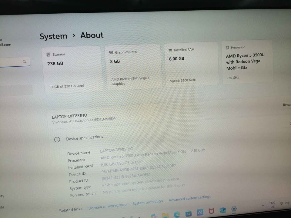 ASUS VIVOBOOK (238 GB) AMD RYZEN 5 3500U WITH RADEON VEGA MOBILE GFX CPU @ 2.10GHZ 8GB RAM SSD1004