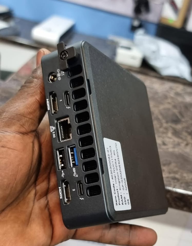 INTEL NUC Kit NUC11TNKi3 CORE I3 11TH GEN,4GB RAM,256GB SSD BRAND NEW SEALED The Intel NUC Kit NUC11TNKi3 have a soldered-down 11th generation intel core quad core or dual core processor with up to 28 W TDP. Two 260-pin 1.2V DDR4 SDRAM small outline dual lnline memory module sockets. Integrated graphics performance is significantly impacted by power levels and memory selection. It has 0 to 40 C external ambient temperature. MEMORRY :4GB RAM DDR4 DRIVE: 256GB SSD NVME HDMI PORTS : X 2 USB PORTS X 2 REAR USB PORTS: X 2 TYPE C PORTS : X 2 Available @ INFOTECH COMPUTERS with a variety of desktops to choose from, you can visit our main branch in CBD at 113 Main street, Marshall Town shop N03 ground floor MATHOMO MALL Opposite Gym Company or you can app us or call us on 0603038546view more/0113540017view more our items covers a 6 months warranty from purchase date. Delivery can be made via the courier guy once purchase has been made. Your sales person Thandiwe