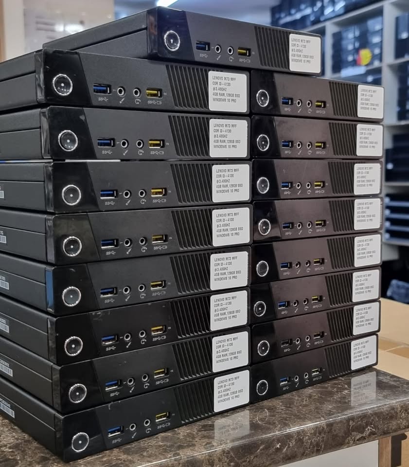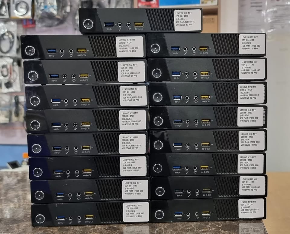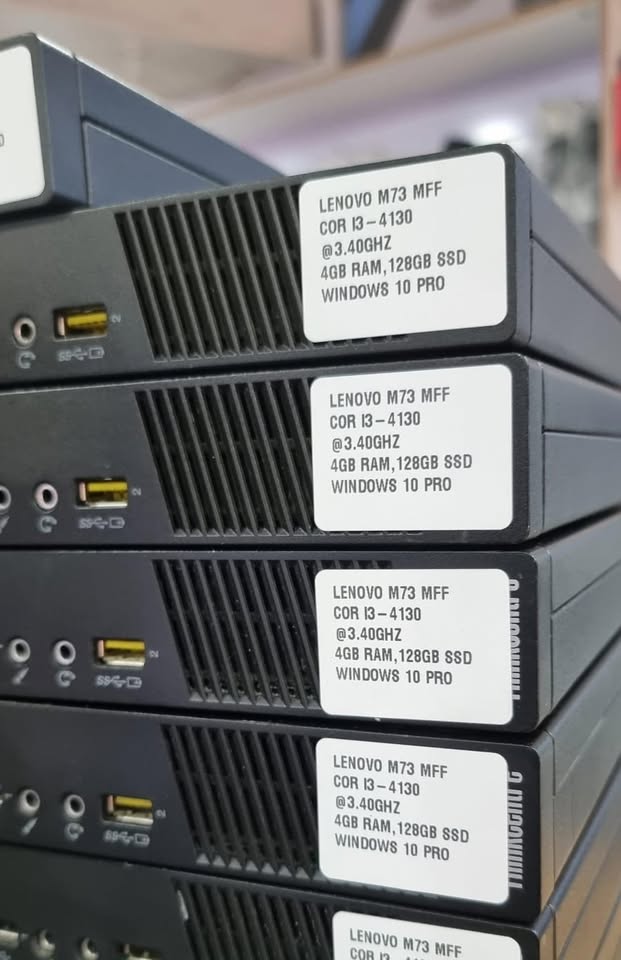 LENOVO THINKCENTRE M73 TINY ,CORE I3- 4th Gen,4GB RAM,128GB SSD CERTIFIED REFURBISHED Intel Core i3 (4th Gen) 4150T / 3 GHz Ultra Small Form Factor 4 GB DDR3,128GB SSD (16 GB max) Lan High Definition Audio in and out Built in Speaker 4K Display Port, VGA (Max Monitors Supported: 2) 1 X USB 3 and 4 x USB 2 ( 2 front and 3 rear), Serial Port USB Power Supply included Genuine MS Windows 10 pro 64 BIT Weight: 1.3Kgs Available @ INFOTECH COMPUTERS with a variety of desktops to choose from, you can visit our main branch in CBD at 113 Main street, Marshall Town shop N03 ground floor MATHOMO MALL Opposite Gym Company or you can app us or call us on 0603038546view more/0113540017view more our items covers a 6 months warranty from purchase date. Delivery can be made via the courier guy once purchase has been made. Your sales person Thandiwe