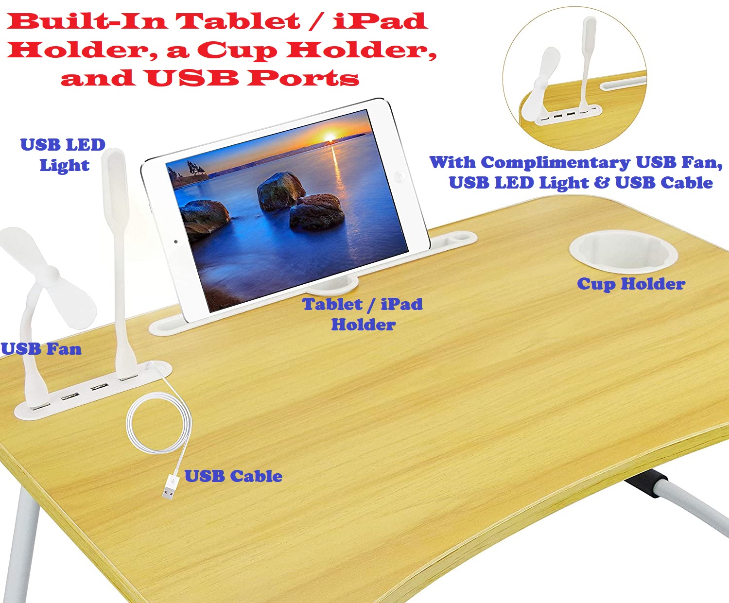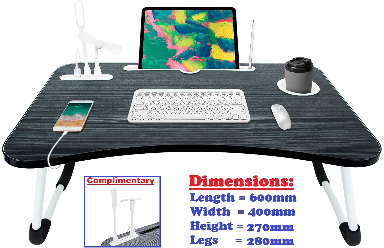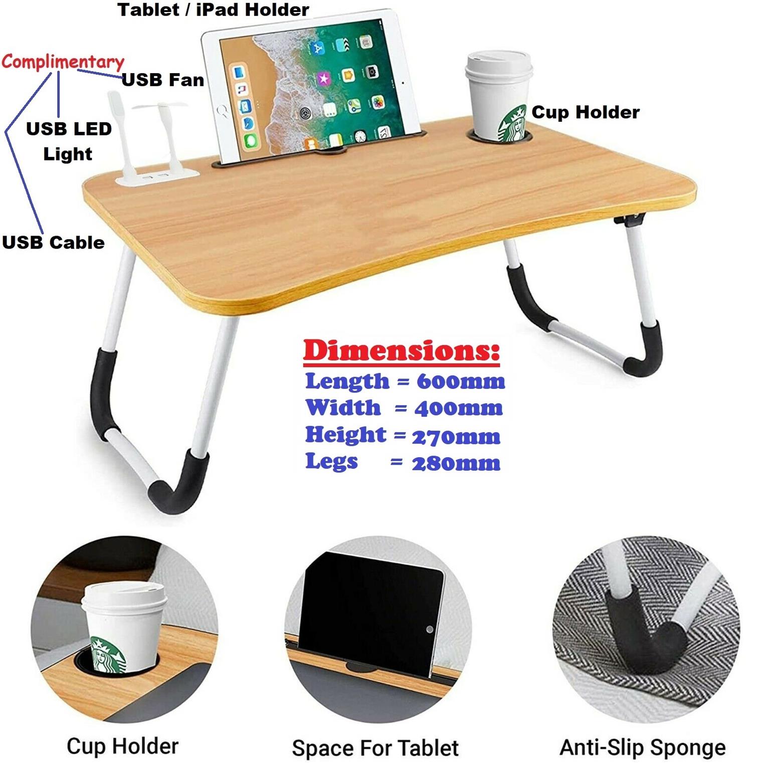 Very Large Laptop Table, Stand with USB Ports and Complimentary USB LED Light, USB Fan, USB Cable.
