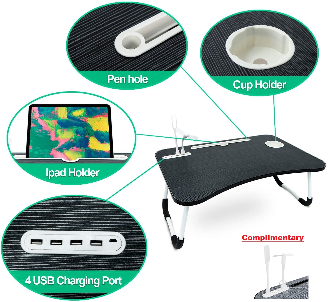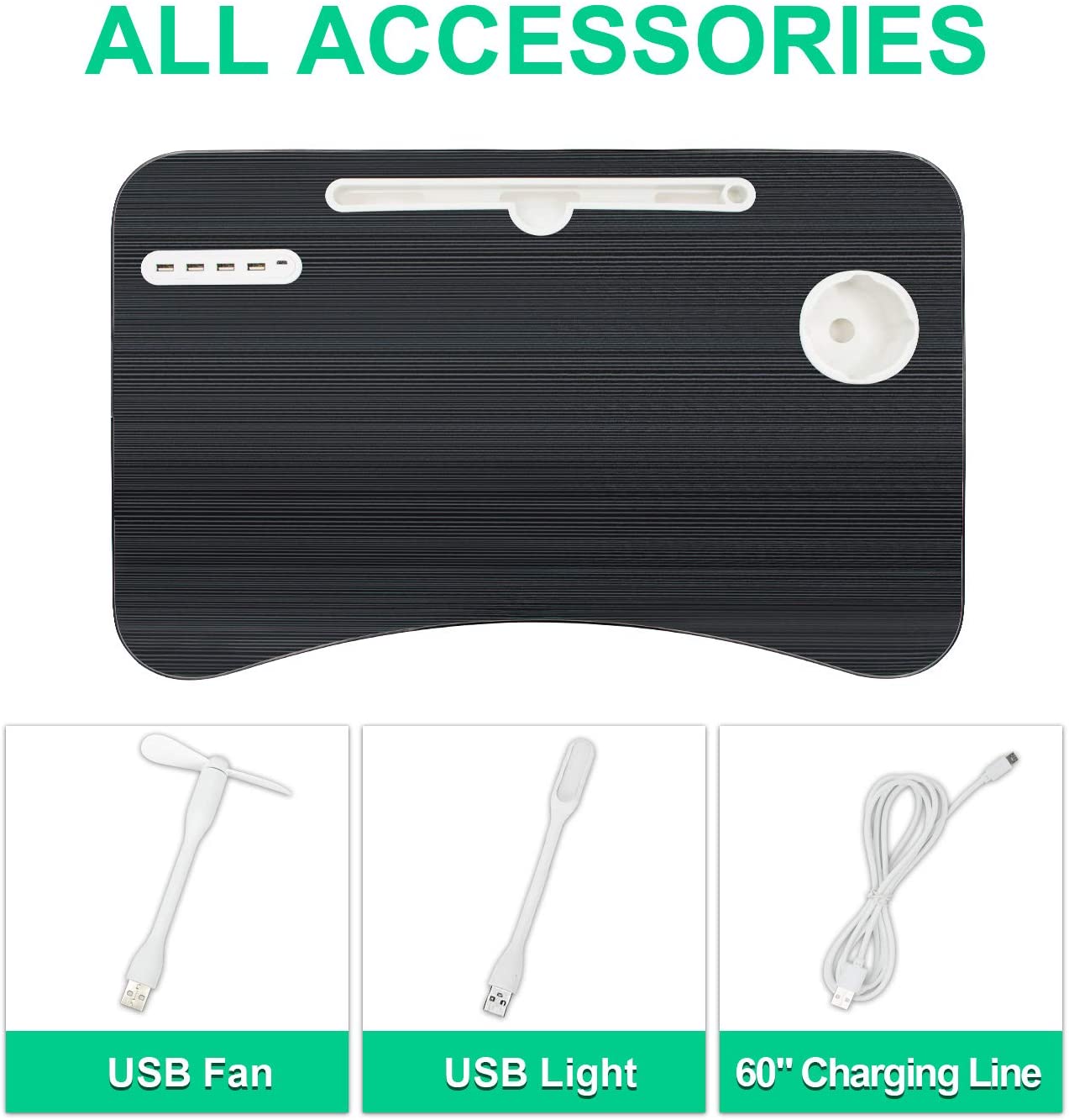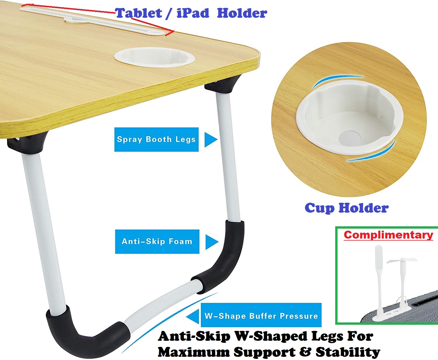 Very Large Laptop Table, Stand with USB Ports and Complimentary USB LED Light, USB Fan, USB Cable.