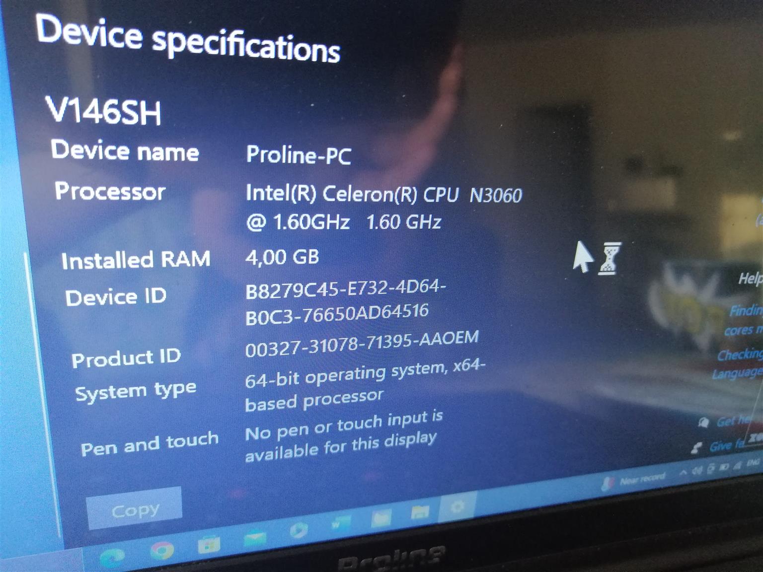 Intel celeron CPU. N3060 1.6Ghz. 4 Gb ram. PROLINE V146HS. windows 10. Battery life 4 hours. Laptop is in a prestine condition.