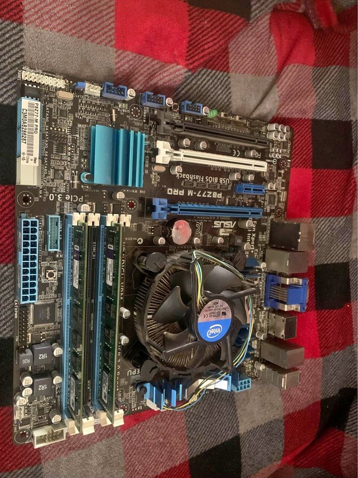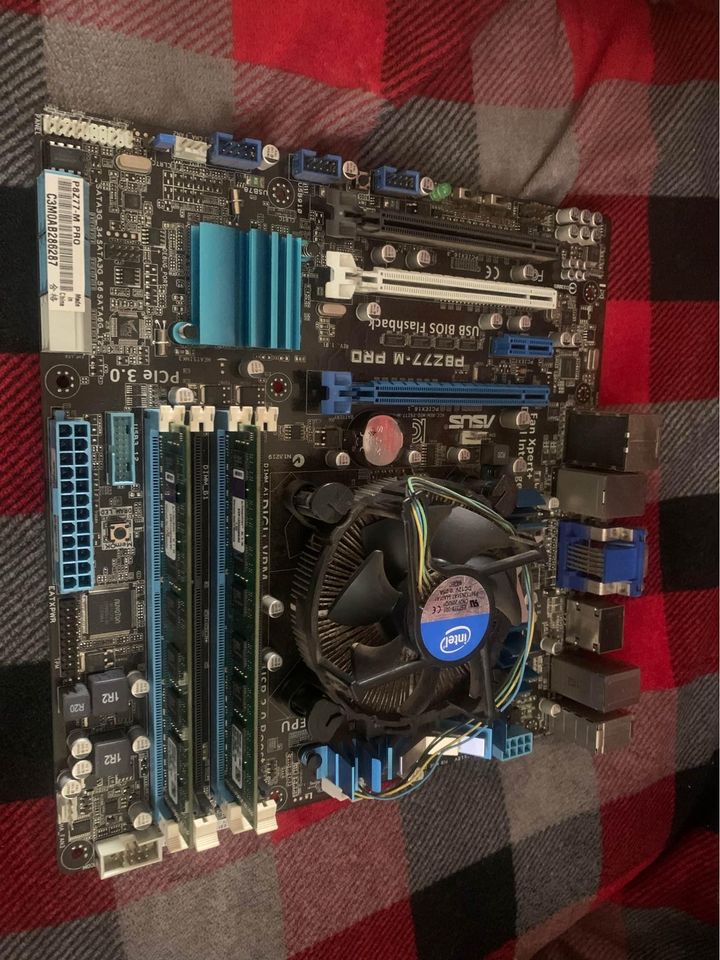 Asus P8z77 M Pro + Intel i7 3770k CPU + 2 8GB DDR3 RAM sticks. All working perfectly fine!