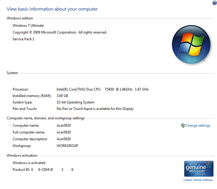 Acer Aspire 5920 Laptop 3Gb RAM