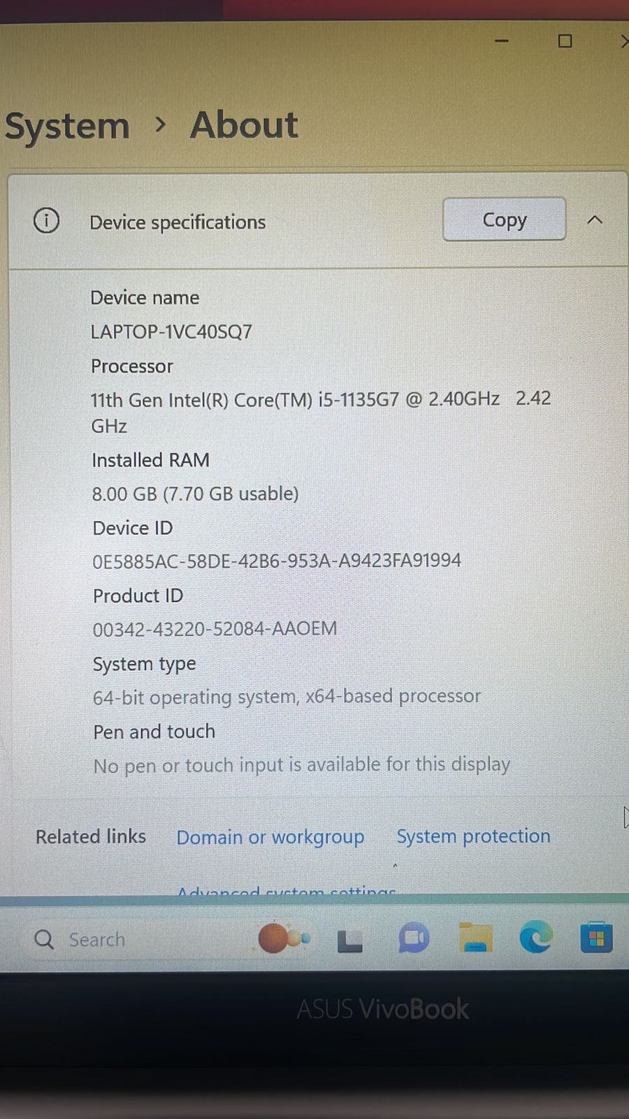 Device name LAPTOP-1VC40SQ7 Processor 11th Gen Intel(R) Core(TM) i5-1135G7 @ 2.40GHz 2.42 GHz Installed RAM 8.00 GB (7.70 GB usable) Device ID 0E5885AC-58DE-42B6-953A-A9423FA91994 Product ID 00342-43220-52084-AAOEM System type 64-bit operating system, x64-based processor Pen and touch No pen or touch input is available for this display.