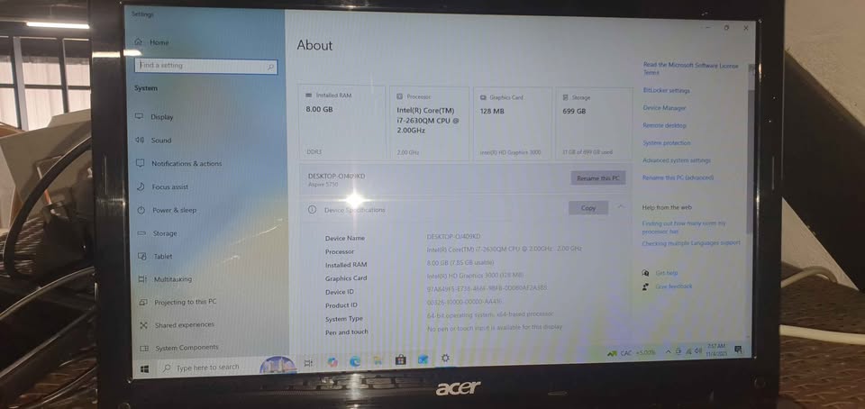 Device Name DESKTOP-CU40PBD (Acer Aspire 575G) - Processor Intel(R) Core(TM) i7-2630QM CPU @ 2.00GHz This is a 2nd generation Intel Core i7 processor. Installed RAM 8.00 GB (7.85 GB usable) This is a decent amount for general use and multitasking. Graphics Card Intel(R) HD Graphics 3000 (128 MB) This is an integrated graphics solution, suitable for basic tasks and older/less demanding games. Storage 699 GB (31 GB of 699 GB used, according to the top right of the screenshot) This indicates a hard drive (HDD) capacity of about 700 GB. System Type 64-bit operating system, x64-based processor - Product ID 00326-30000-00000-AA646 - Pen and touch No pen or touch input is available for this display -