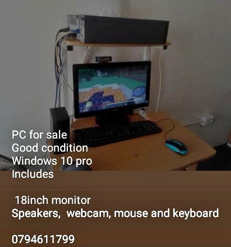 Good morning good ppl, I'm from Venterspost, I'm selling my PC (Windows 10 Pro) with (Keyboard, 1 USB mouse and 1 Blue-tooth mouse, Speakers and Webcam) if interested, pls send me a whatsapp message on