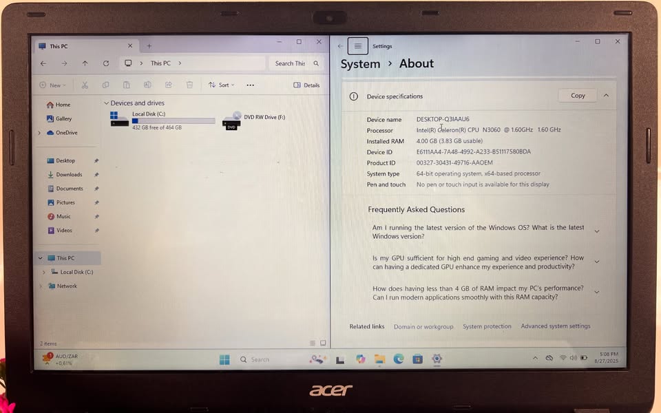 256GB SSD 👌🏾 4GB DDR3 RAM Intel™ Celeron Processor N3060 1.60GHz Processing Speed DVD & CD ROM SD Card Slot 3 USB Ports Windows 11 O.S HDMI Video Port QWERTY Keyboard Mic & Stereo 3.5mm Port 15.6inch Display Screen Good Condition Good Battery > Charger Included >> 90 Days Guarantee ☎️ WhatsApp 📲 📍207 Seventh Avenue, Florida Road Durban, 4001