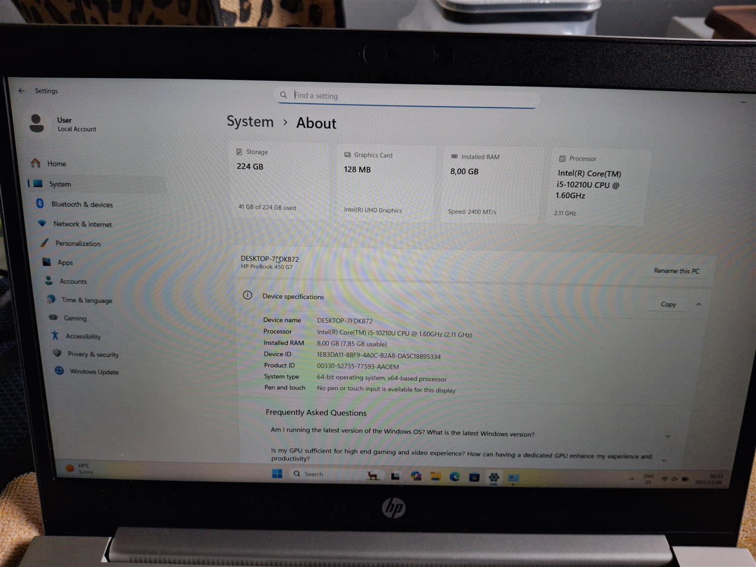Hp Pro Book i5 10th Gen ,256 SSD hard drive, 8 gig ddr4 ram, windows 11 pro + Microsoft Office 2024 Professional Plus + original hp charger and bag. Battery is still excellent. R5500