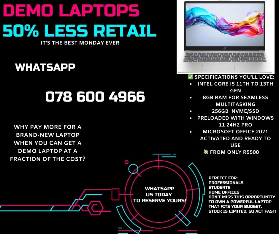 💻 Ex-Lease & Demo Units 🔹 Prices from R3500 to R5500 🔹 Specs: Intel i5 (8th to 12th Gen), 8GB RAM, 256GB SSD