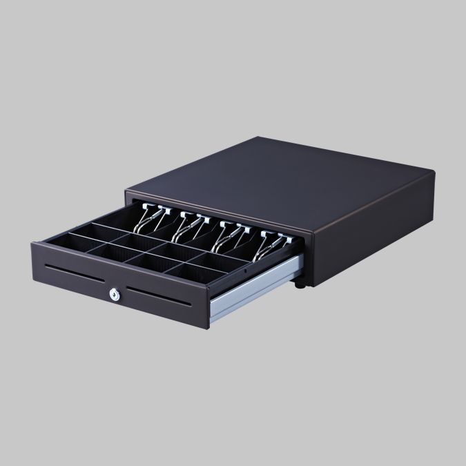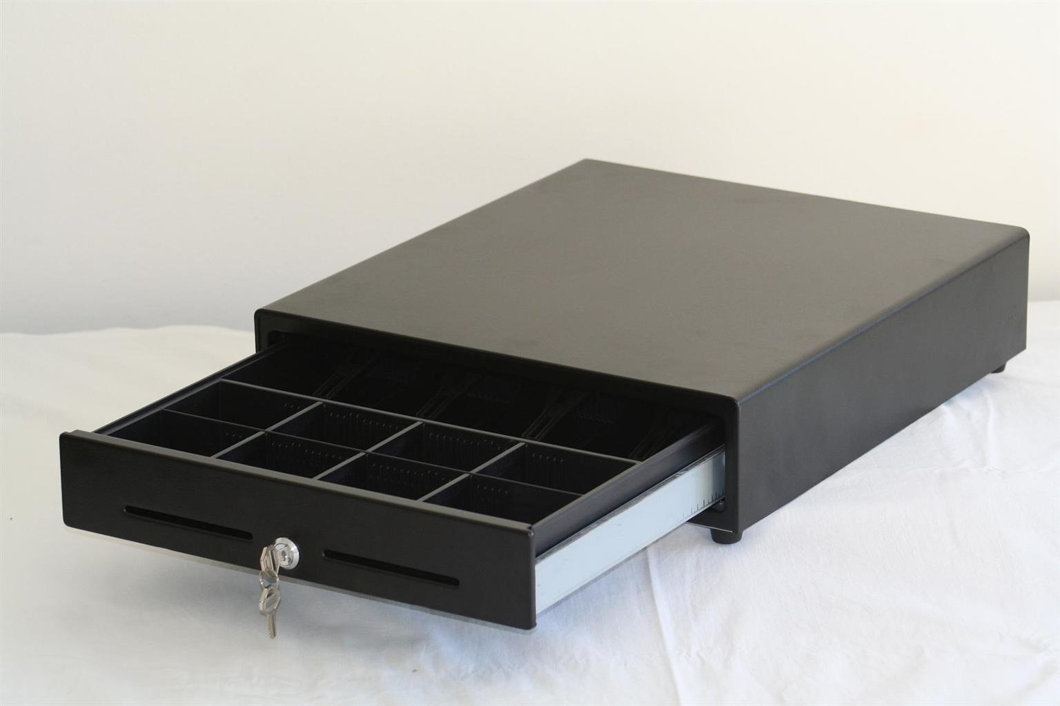New black metal outer with wire note clip holders and 8 coin trays. 3 year warranty