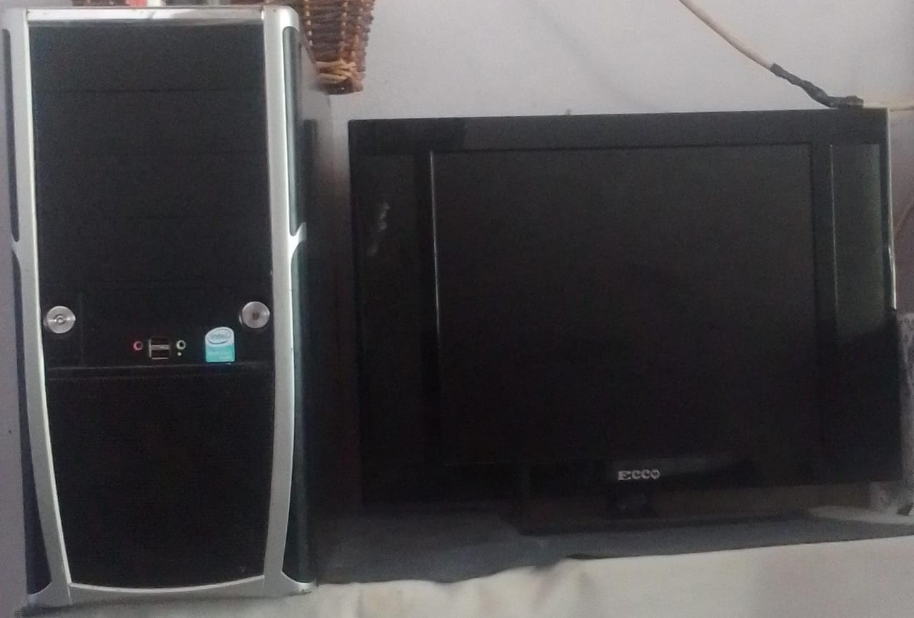 Intel desktop tower, functional but needs a new hard drive and an Ecco flat screen it only needs a power cable it's fully functional