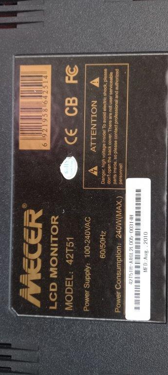 Mecer 42" LCD Monitor Model 42T51 with wall bracket. 16:9 Full HD 1080P LCD Panel, *1920 x 1080 *2 x HDMI, 1 x VGA, 2 x S-Video, 2 x RCA, 1 x USB *Built-in Media Player, *Built-in Speakers (10W x 2)
