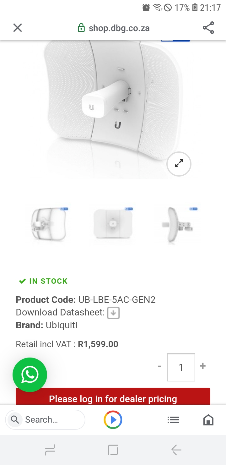 Ubiquiti Litebeam Gen 2 AC 23db WI-FI dish and MikroTik hAP mini router. It is an "open system" and not ISP locked. New dish retails for R1599 to R1799. Reason for selling is that I upgraded to Fibre. System was in use less than 1 year. Excellent overall and working condition.
