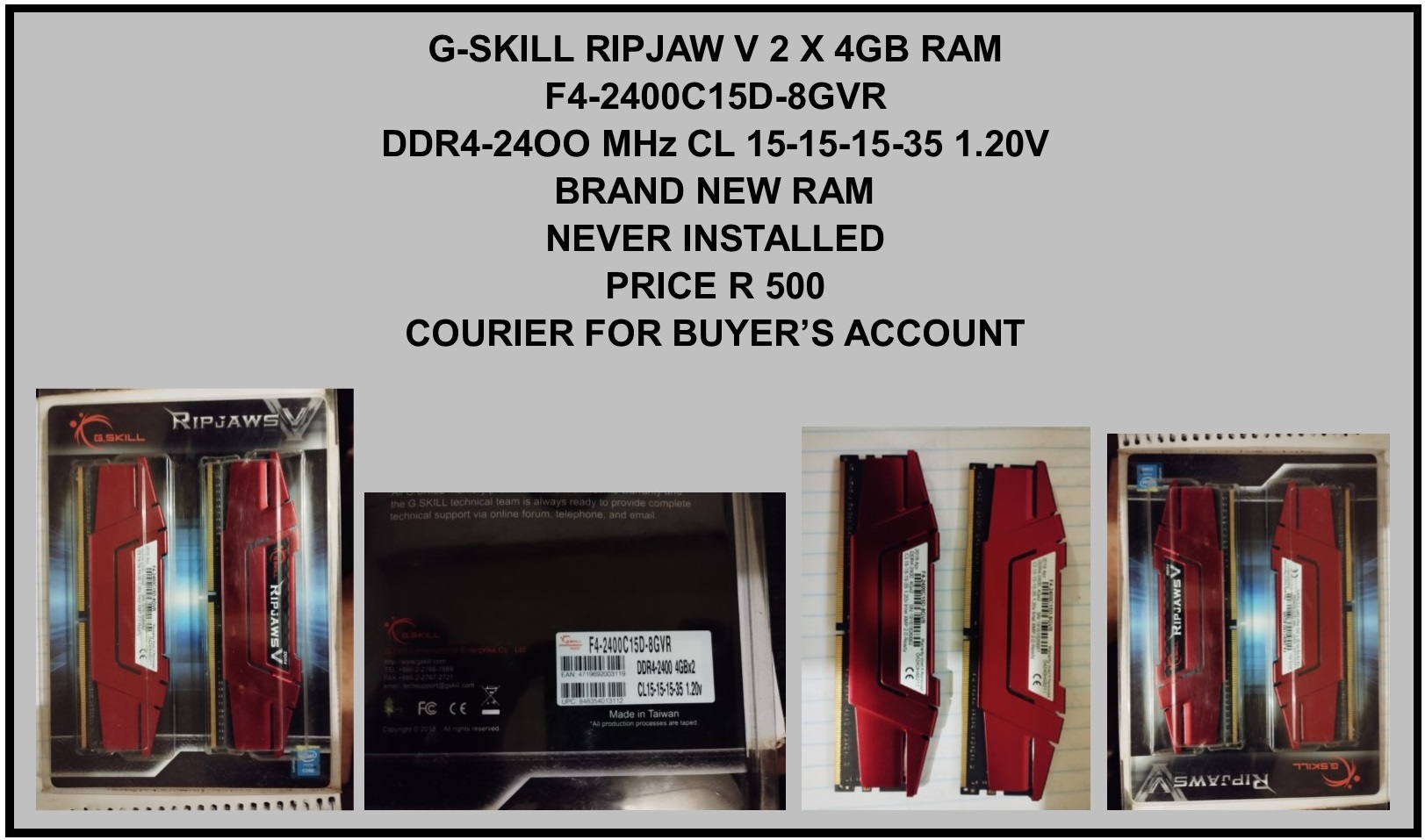 G-SKILL RIPJAW V 2 X 4GB RAMF4-2400C15D-8GVRDDR4-24OO MHz CL 15-15-15-35 1.20VBRAND NEW RAMNEVER INSTALLED