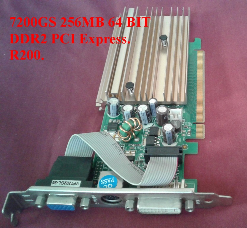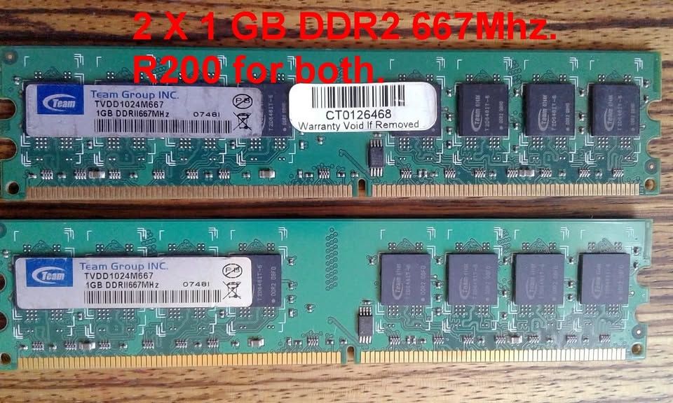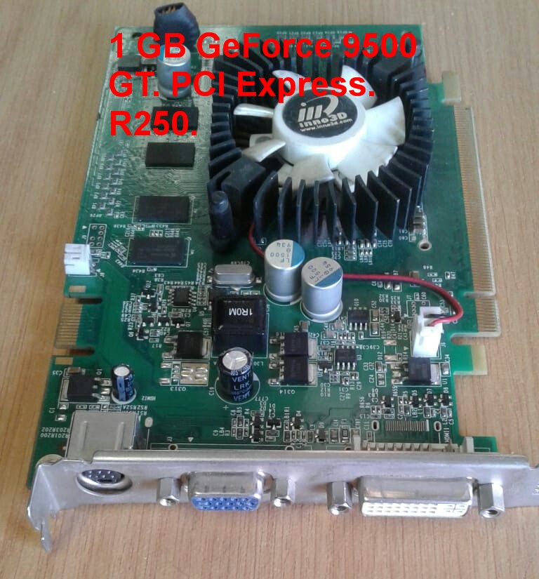 Computer parts for sale. Prices in photos. 1 GB GeForce 9500 GT. PCI Express. R250. 7200GS 256MB 64 BIT DDR2 PCI Express. R200. Pci express. Radeon 9550 256mb V/D/VO graphics card. R200. 2 X 1 GB DDR2 667Mhz. R200 for both. Calix Gigahub 813G-2 router. Up to 1GBPS. R200. 4 PC games. R100 for the lot. 3 X LG 775 heat sinks. R150 for all 3. All in working condition. Contact Michael 0671205901view more or Whatsapp. I’m in Newlands in the Westrand JHB.. Postnet courier extra R100. Pepstores paxi extra R50.