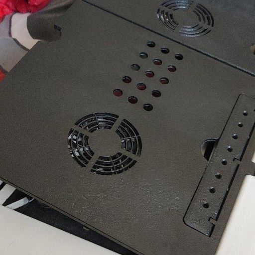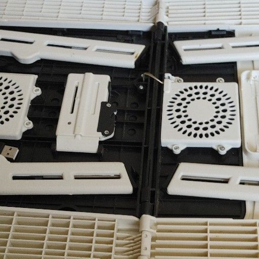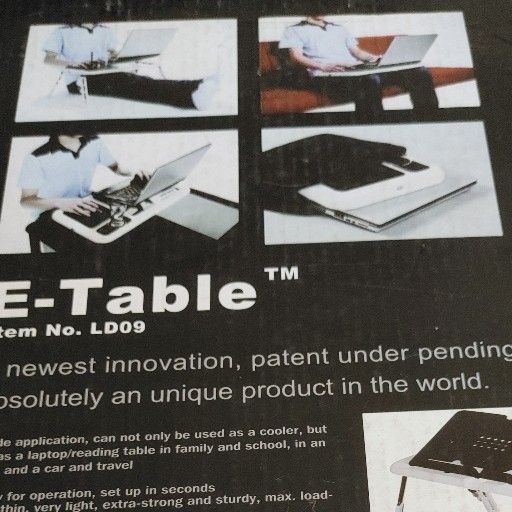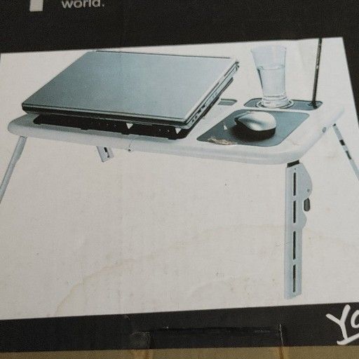 White E Table with adjustable legs. Has 2 fans and a mouse pad