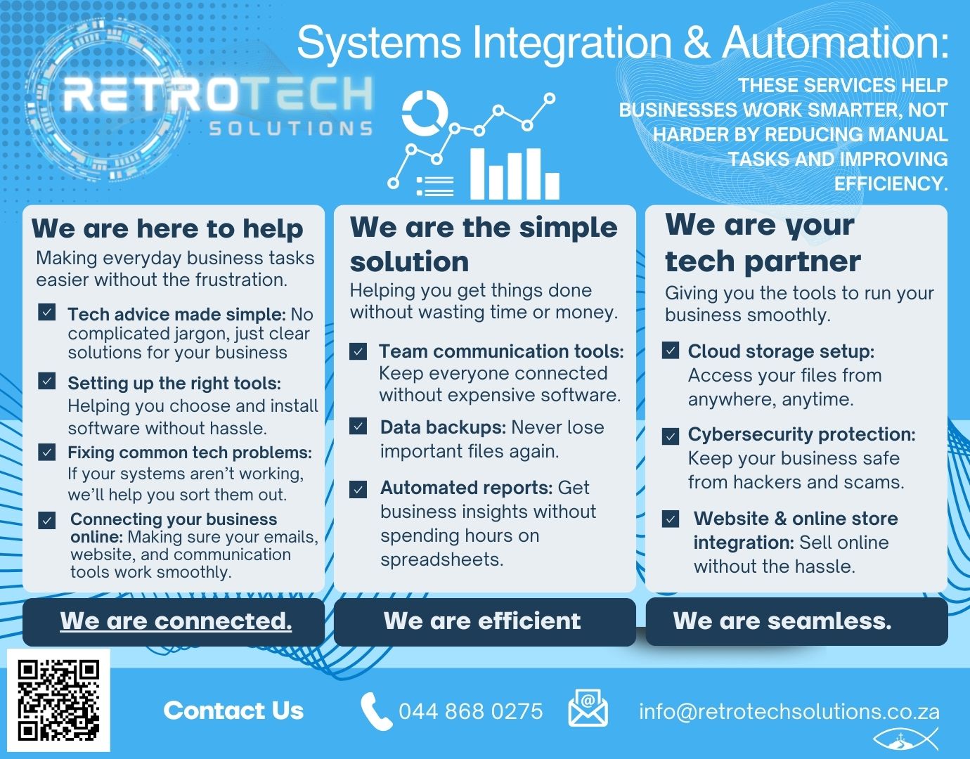 Tired of doing the same tasks over and over? Still jumping between systems that don’t talk to each other? Let us change that. At Retrotech Solutions, we connect your systems and build smart automations so your business runs smoother, faster, and with less effort.